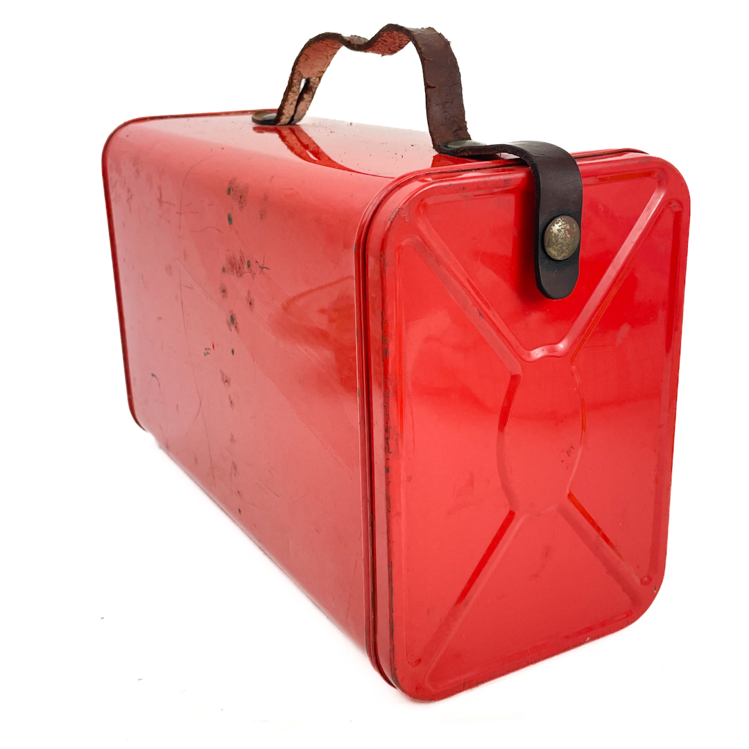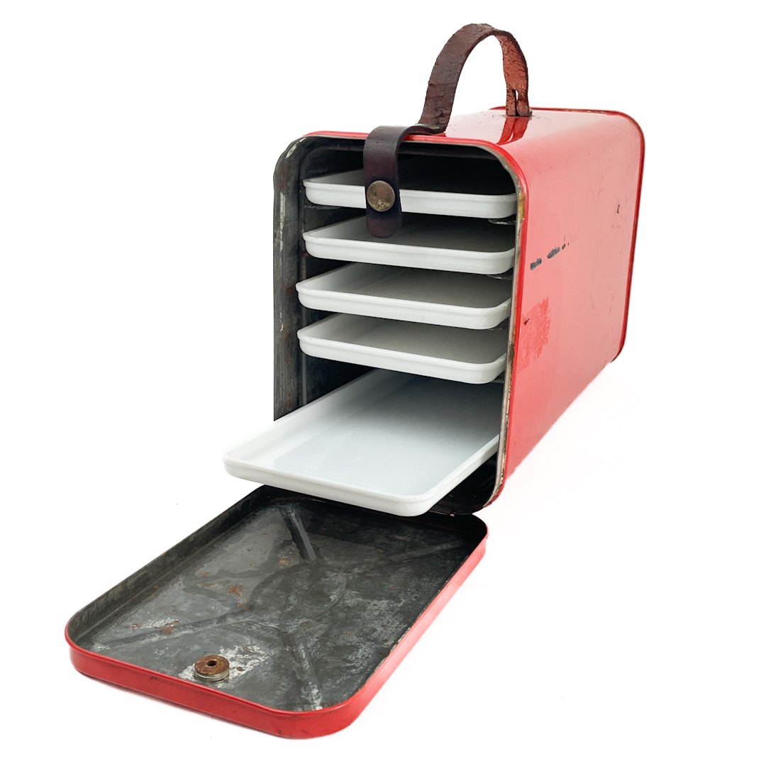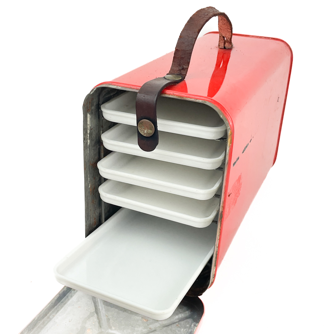 Fantastische rote Retro-Brotdose aus Metall mit fünf weißen Innenfächern.