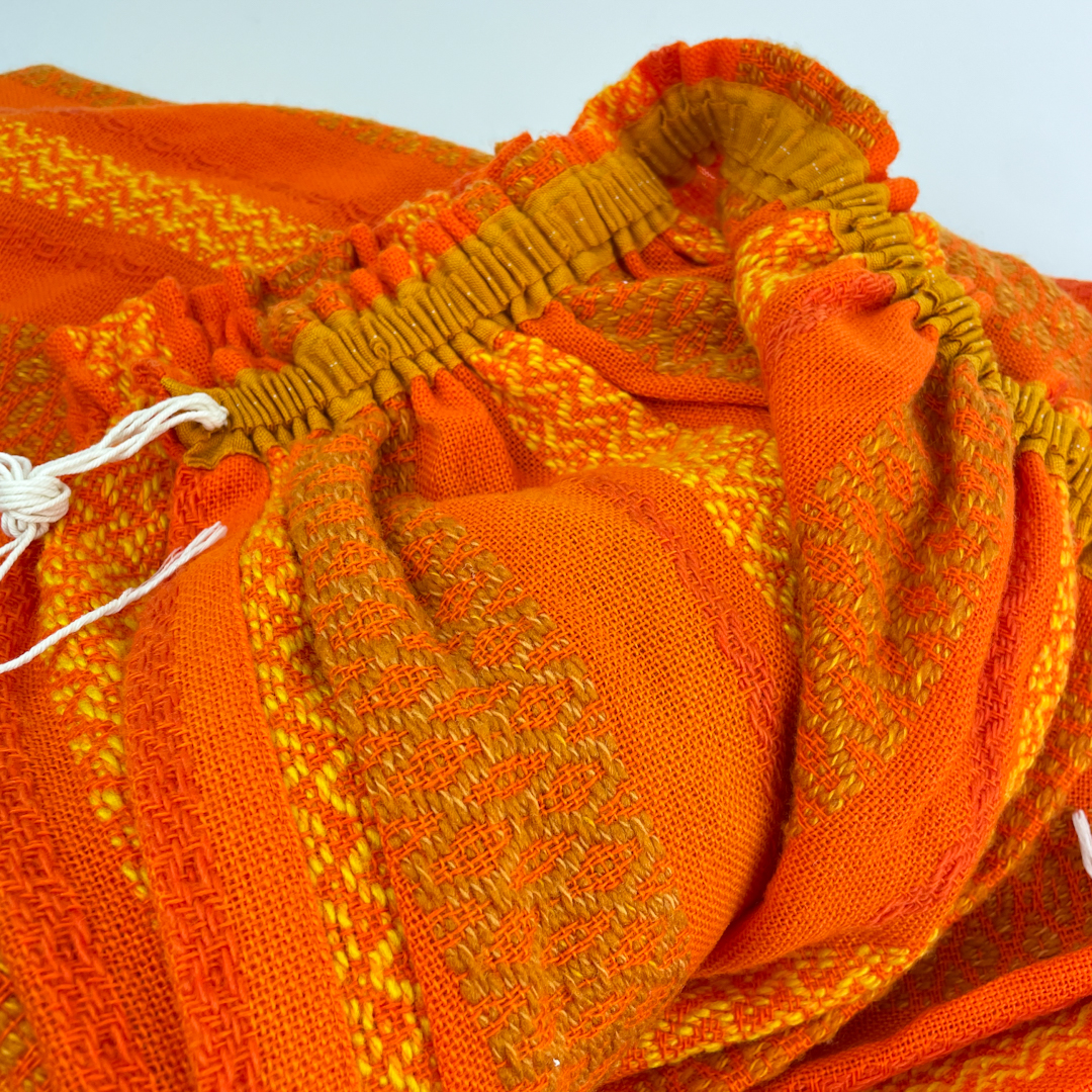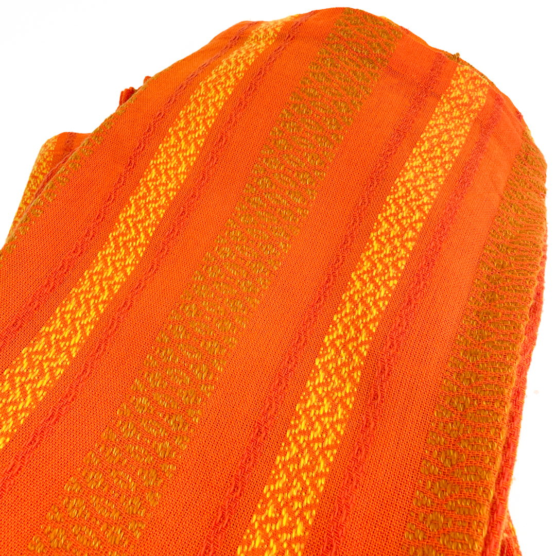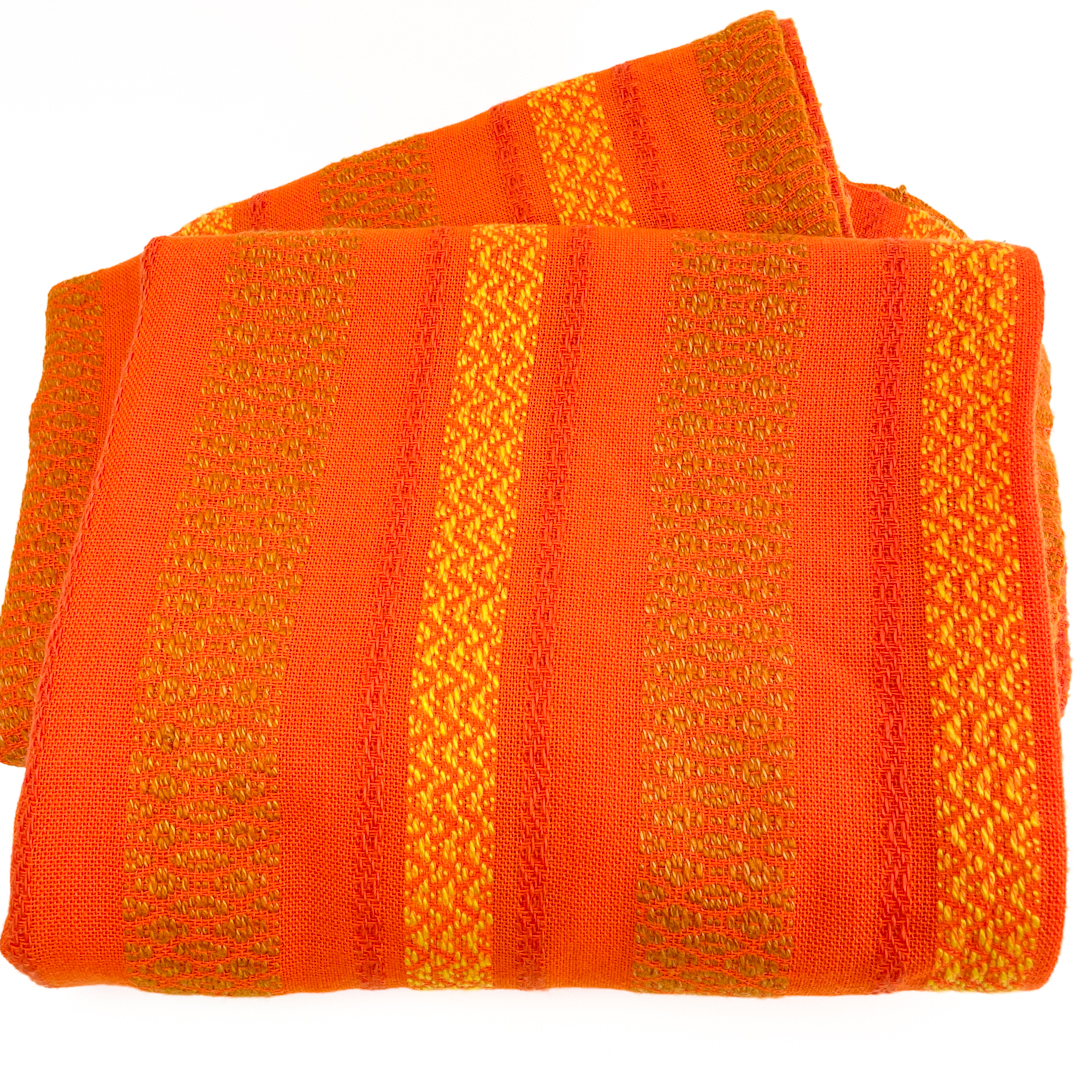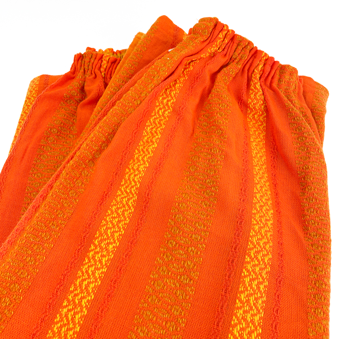 Wunderschöner Retro-Vorhang aus leichter, bügelfreier Qualität mit dekorativen Streifen in warmen Orange- und Gelbtönen.