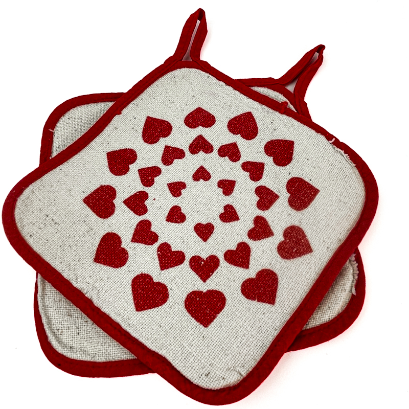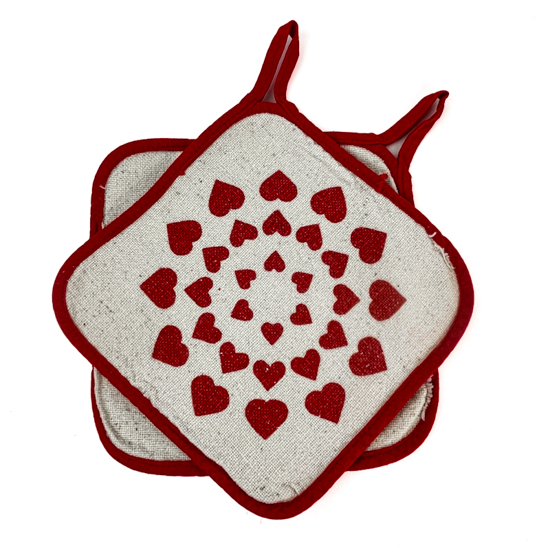 Schöne Retro-Topflappen aus festem Leinenstoff mit roten Herzen in Kreisform angeordnet.