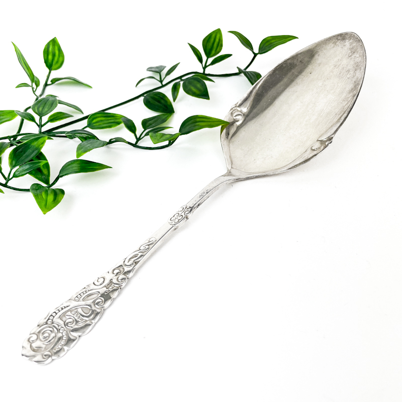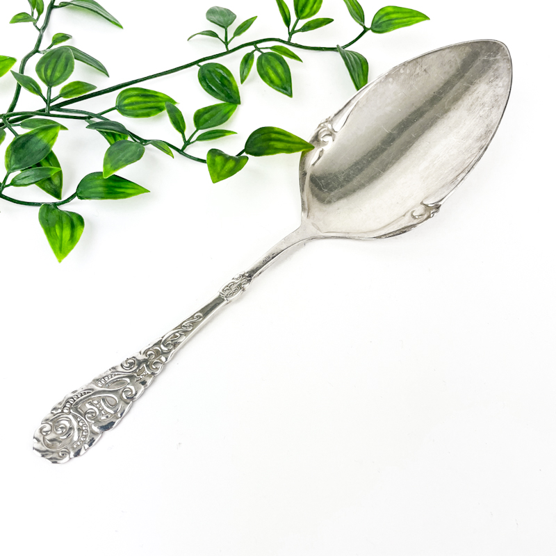 Eleganter Vintage Tortenheber aus Silberauflage. Der Griff ist schlicht mit feinen Streifen verziert, und das Blatt hat eine klassische Form. Die Länge beträgt ca. 20 cm. Der Tortenheber ist gut erhalten mit leichten Gebrauchsspuren.