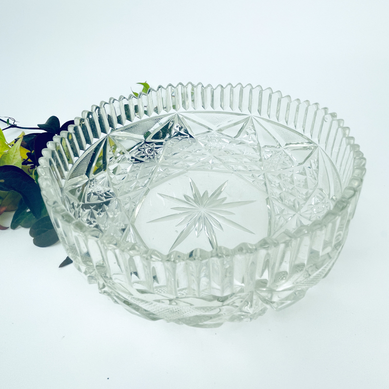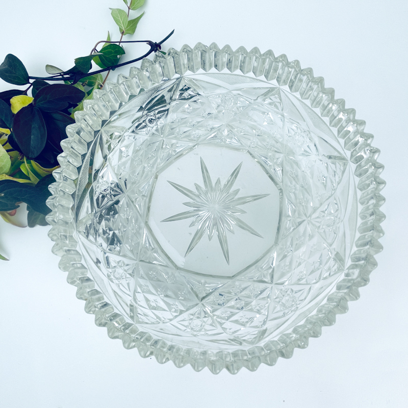 Schöne, schwere Glasschale aus klarem Pressglas mit tiefem Sternmuster und geriffeltem Rand.