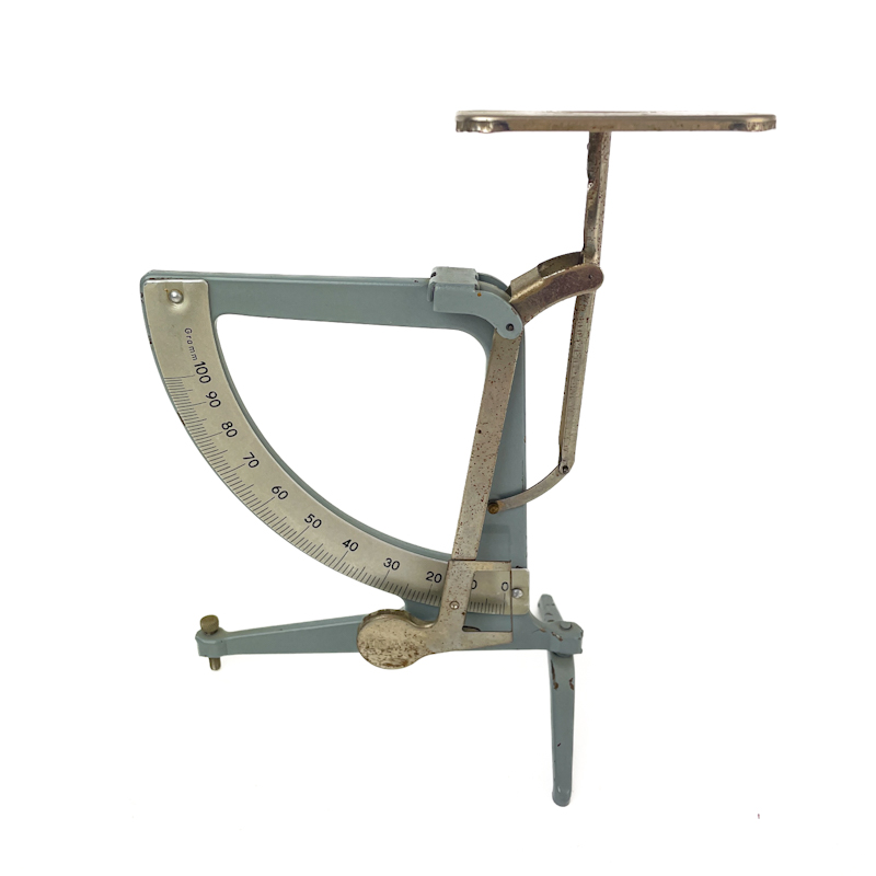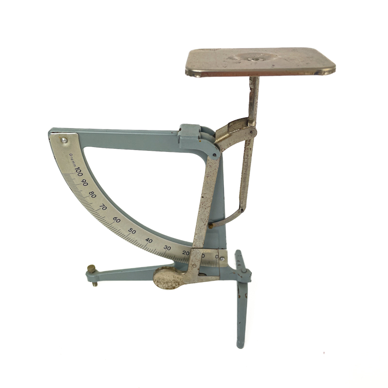Klassische Retro-Briefwaage aus grauem Metall mit verstellbarem Arm und originaler Gramm-Skala.