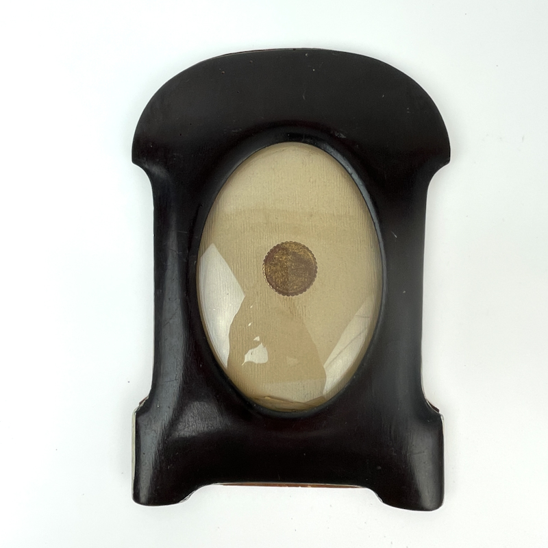 Wunderschöner antiker Bilderrahmen aus dunkel gebeiztem Holz mit ovalem Ausschnitt für ein Porträt oder kleines Druckbild.