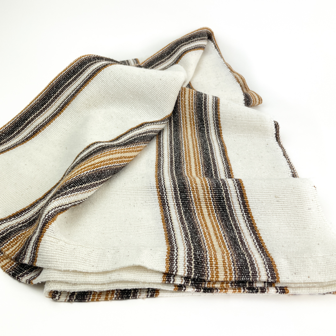 Wunderschöne Retro-Tischdecke aus bügelfreiem Gewebe in Beige mit breiten Streifen in Braun- und Goldtönen.