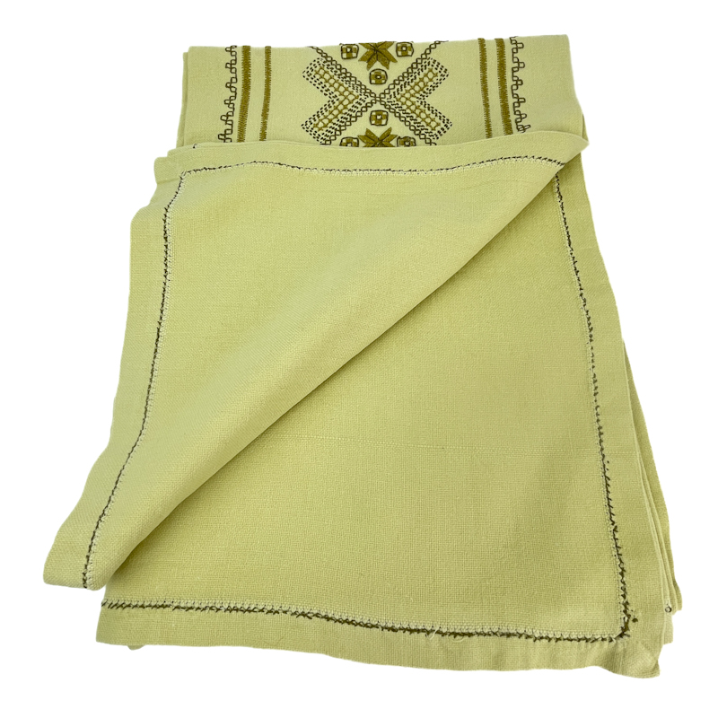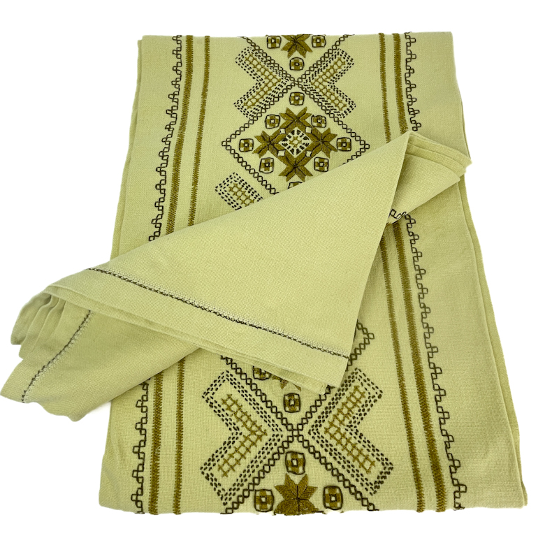 Schöne Tischdecke in olivgrünem Farbton mit mittiger Stickerei in gold- und braunfarbenen Nuancen.