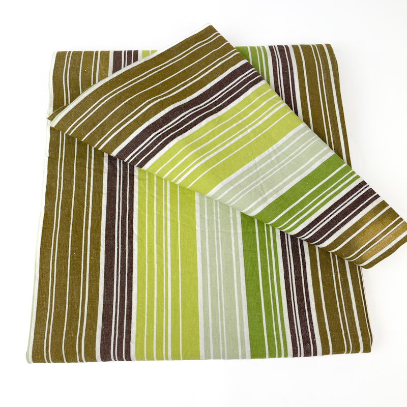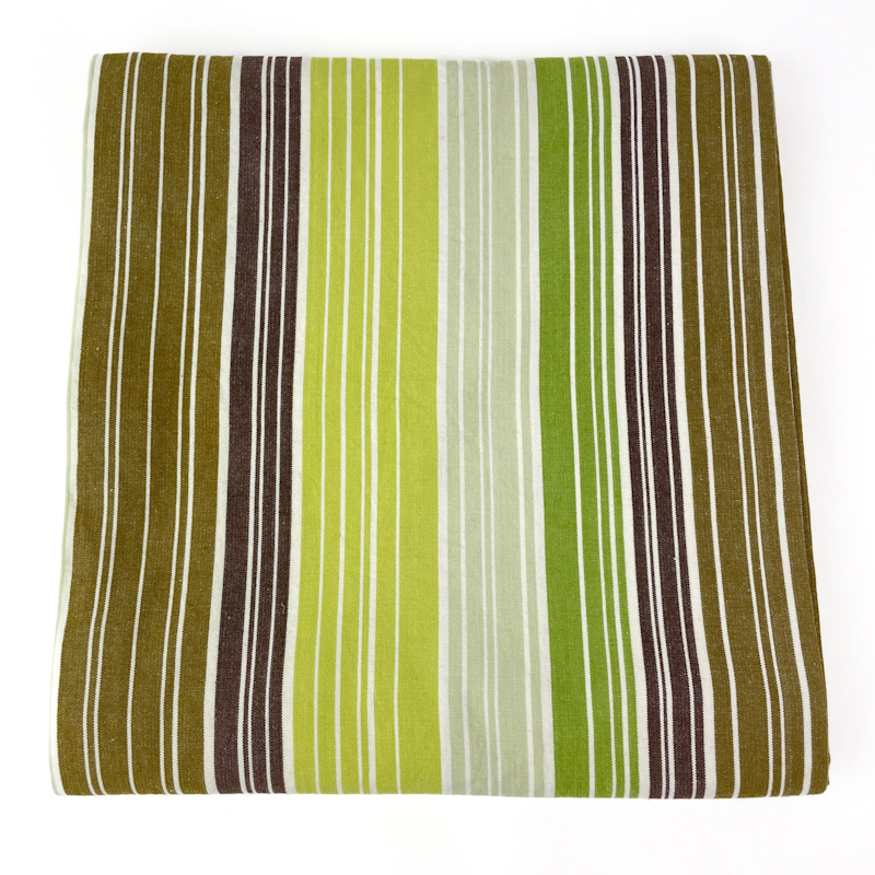 Klassische Retro-Tischdecke aus kräftiger reiner Baumwolle mit schmalen und breiten Streifen in Grüntönen und Braun.