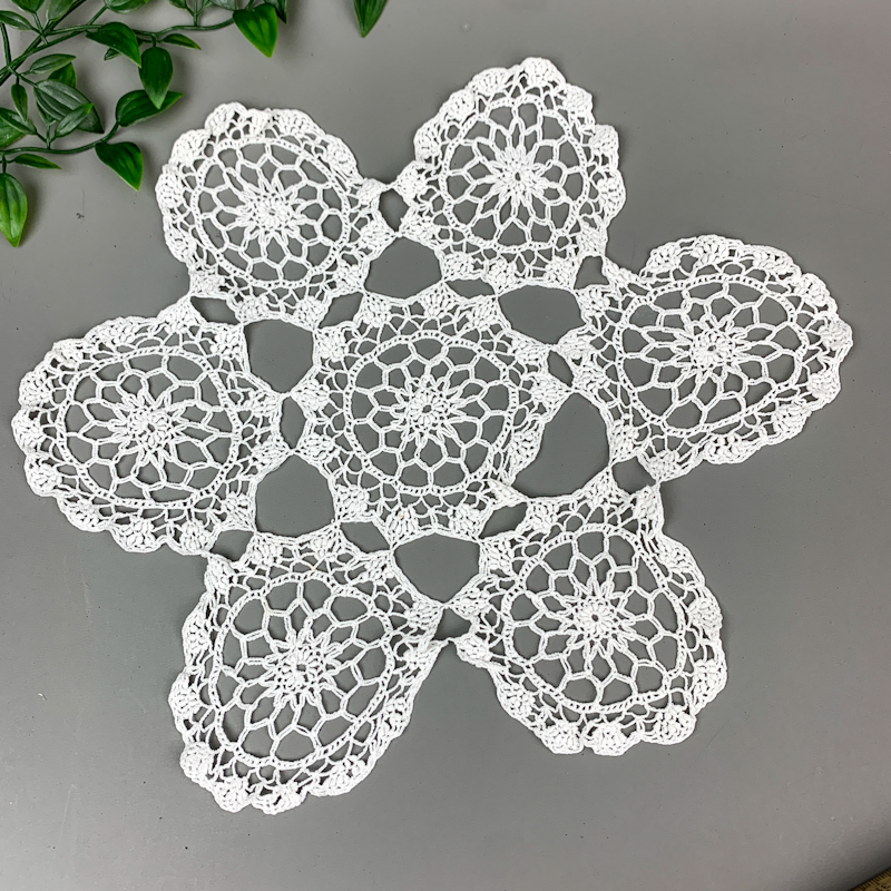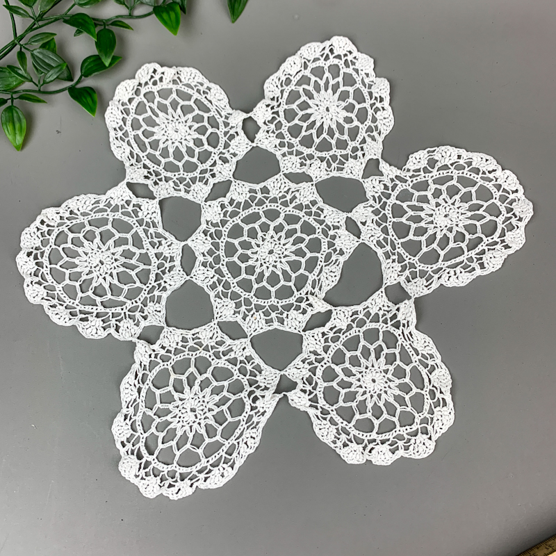 Wunderschönes kleines vintage Deckchen aus gehäkelter reiner Baumwolle mit dekorativen Blumenmotiven in einer hübschen Sternform.