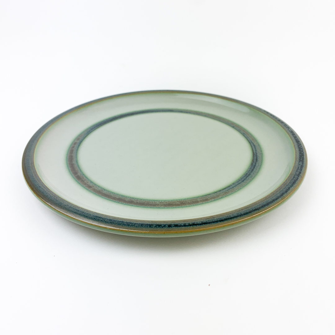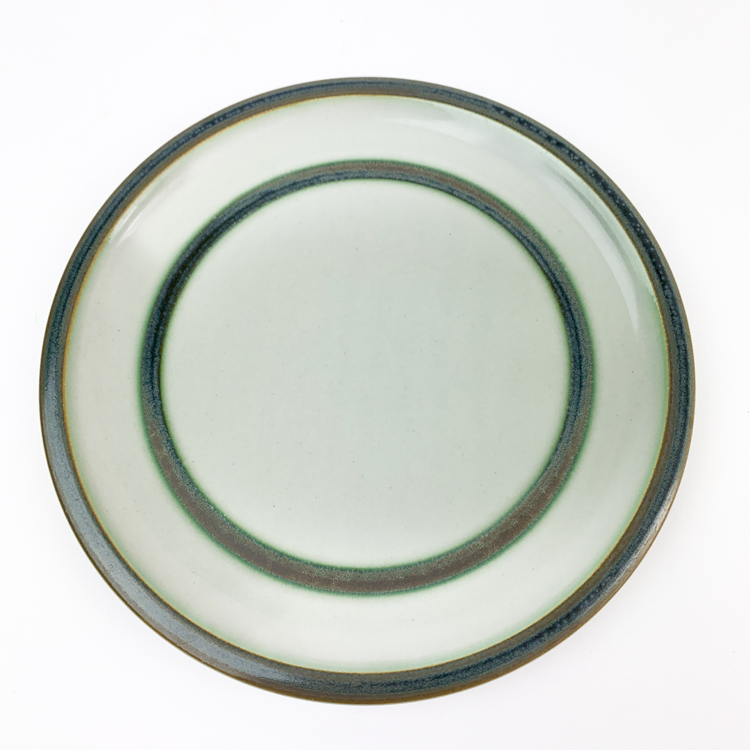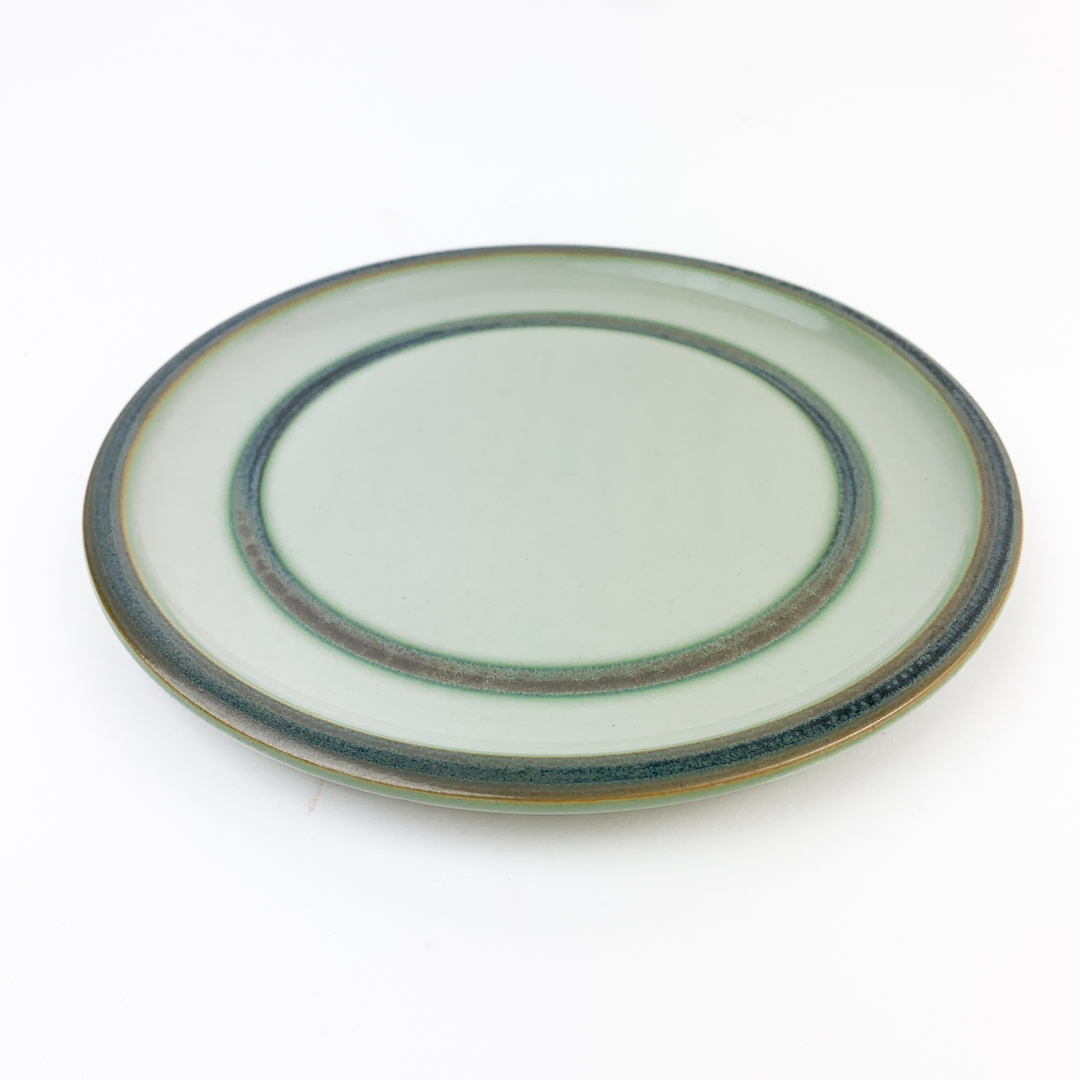 Steinzeug in gedämpften Grün- und Blautönen mit charakteristischem Kreisdekor, typisch für die 1970er Jahre.