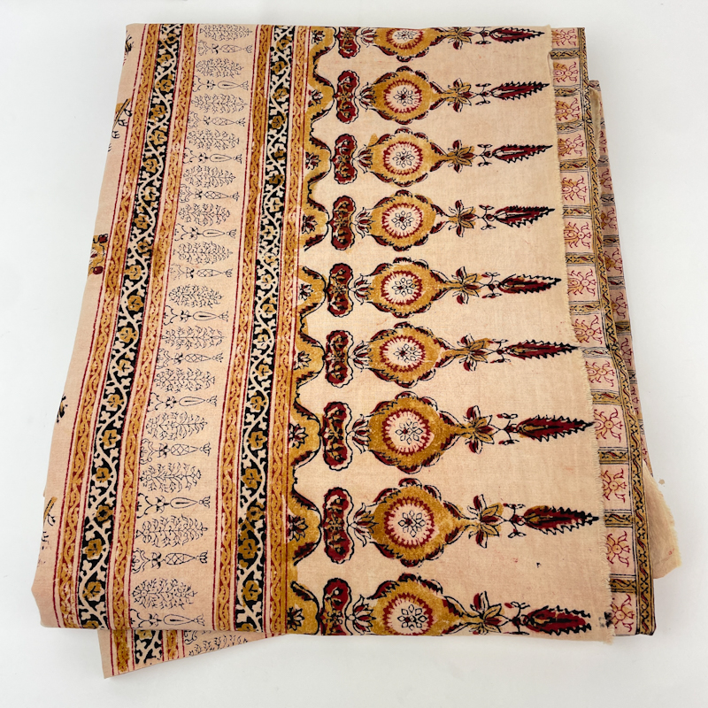 Wunderschöne Retro-Tagesdecke aus reiner Baumwolle mit dekorativem Muster in warmen Beige-, Rosa- und Goldtönen.