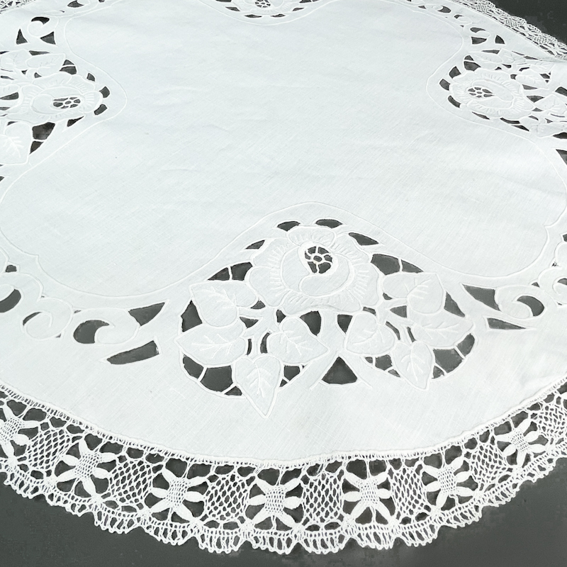 Mit wunderschöner offener Stickerei in Blumenmotiven und feiner gehäkelter Spitzenkante rundum.