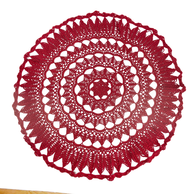 Wunderschöne, handgehäkelte Decke aus dunkelroter Baumwolle mit detailliertem Muster in klassischer runder Form.