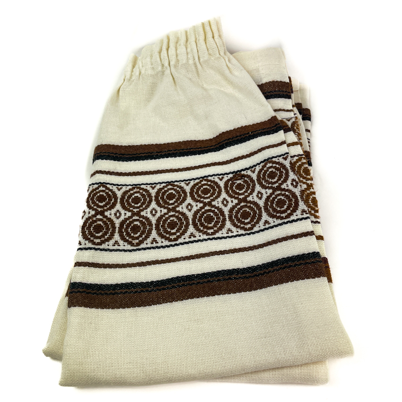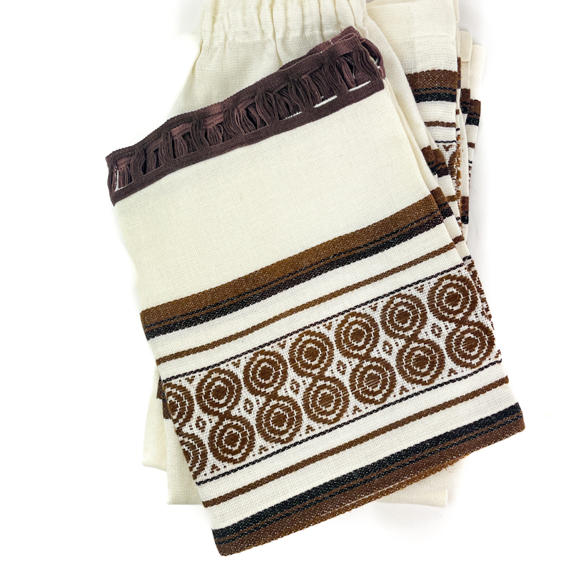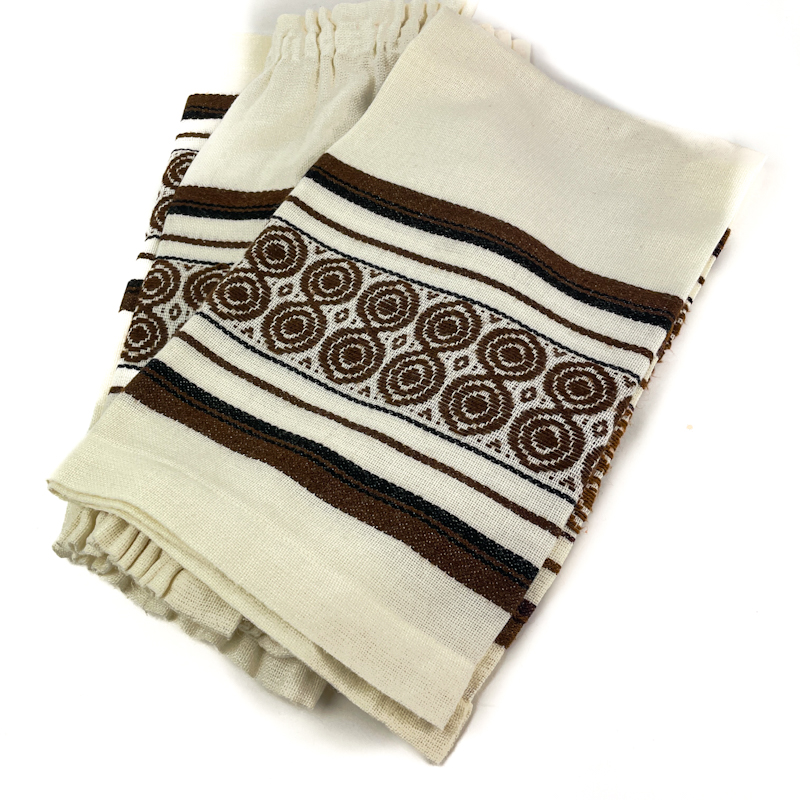 Klassisches Küchengardinen-Set aus bügelfreiem Kunstgewebe mit cremefarbenem Grund und gewebten Streifen- und Kreismustern in Braun und Dunkelbraun.