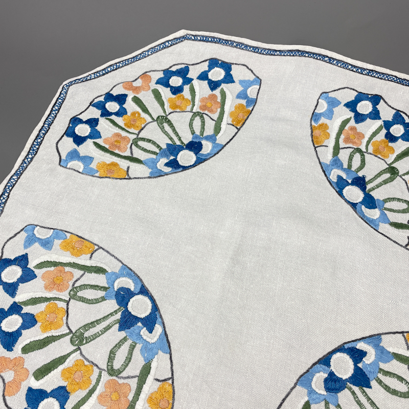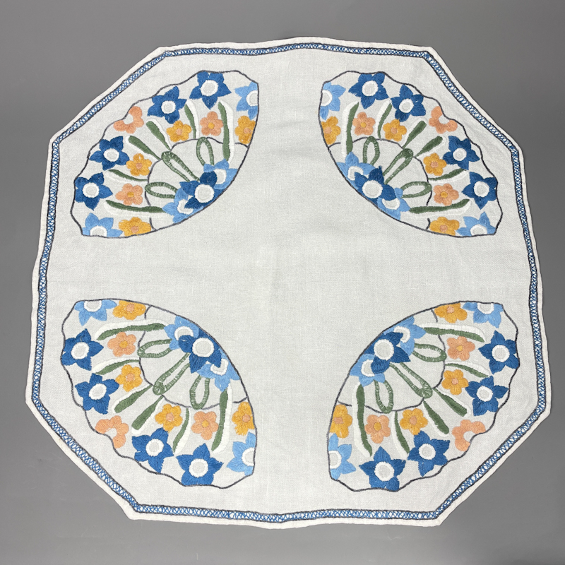 Das Stickmuster zeigt vier feine Blütenmotive, die rund um die Mitte angeordnet sind, eingerahmt von einer handgenähten blauen Bordüre.