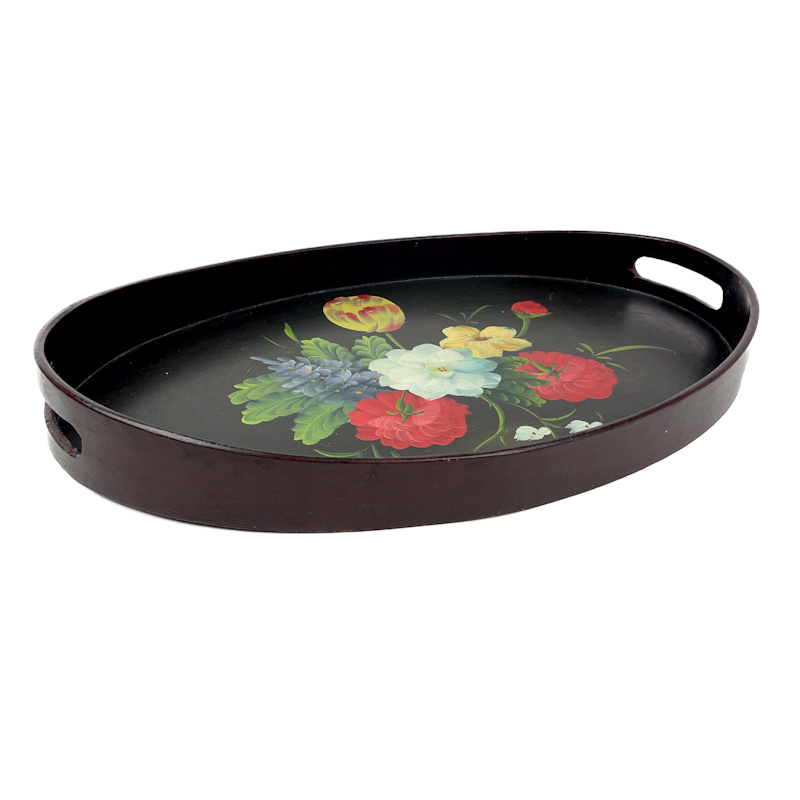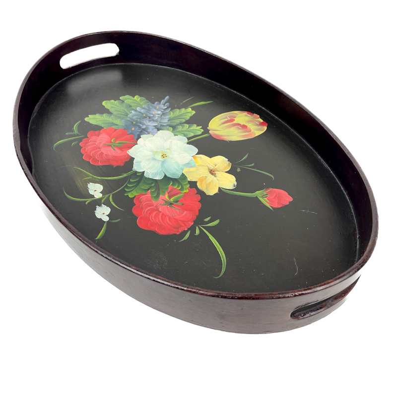 Wunderschönes ovales Retro-Tablett mit handgemaltem Blumenmotiv in kräftigen Farben auf schwarzem Hintergrund.