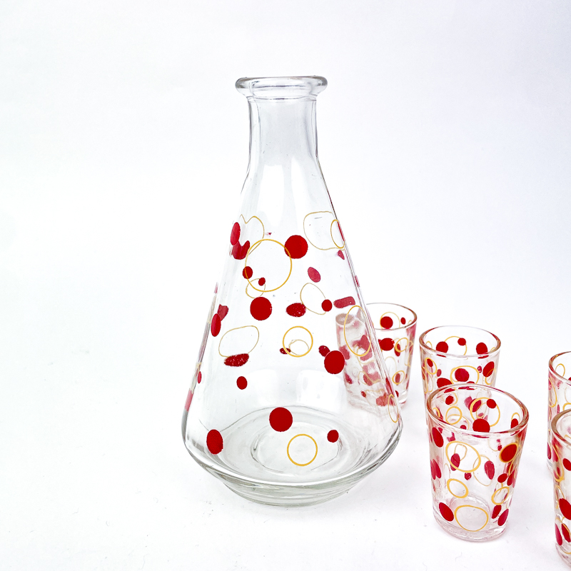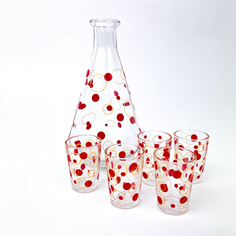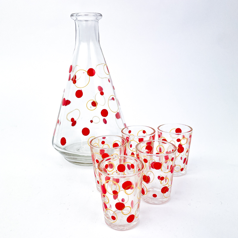Wunderschönes Retro-Karaffelset aus Klarglas mit roten Punkten und goldenen Kreisen.