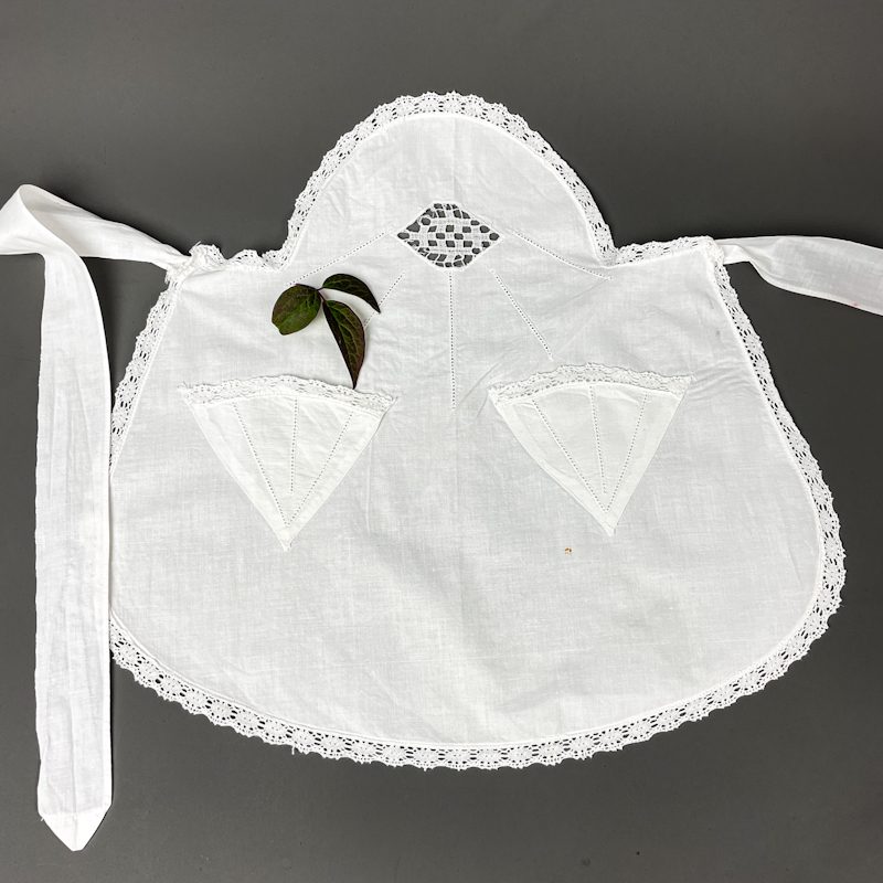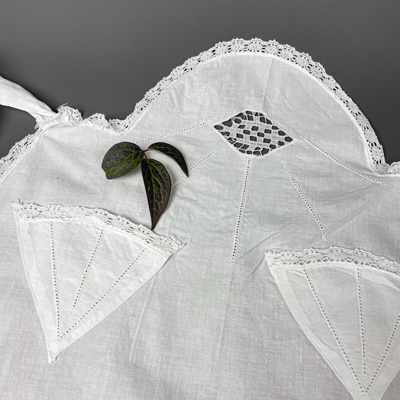Wunderschöne antike Schürze aus reiner weißer Baumwolle mit handgenähten Details und rundumlaufender Häkelkante.