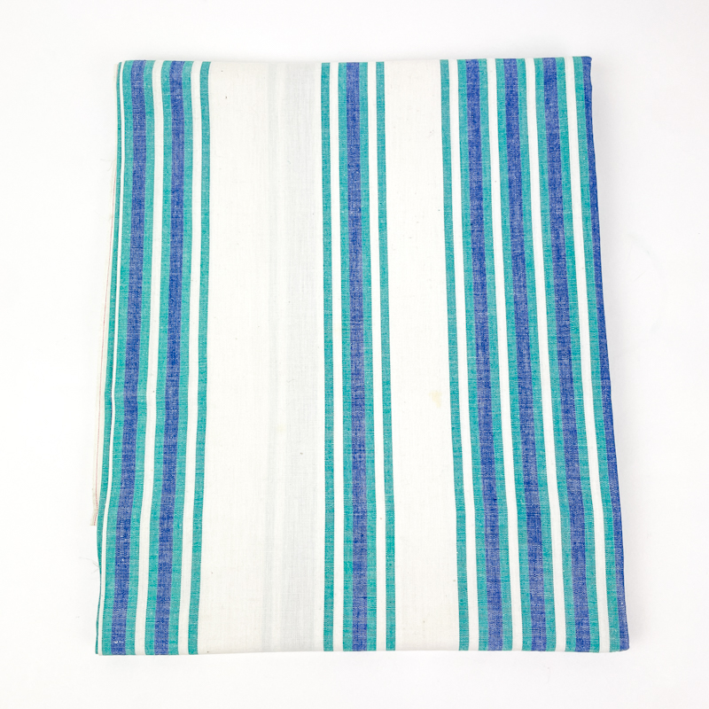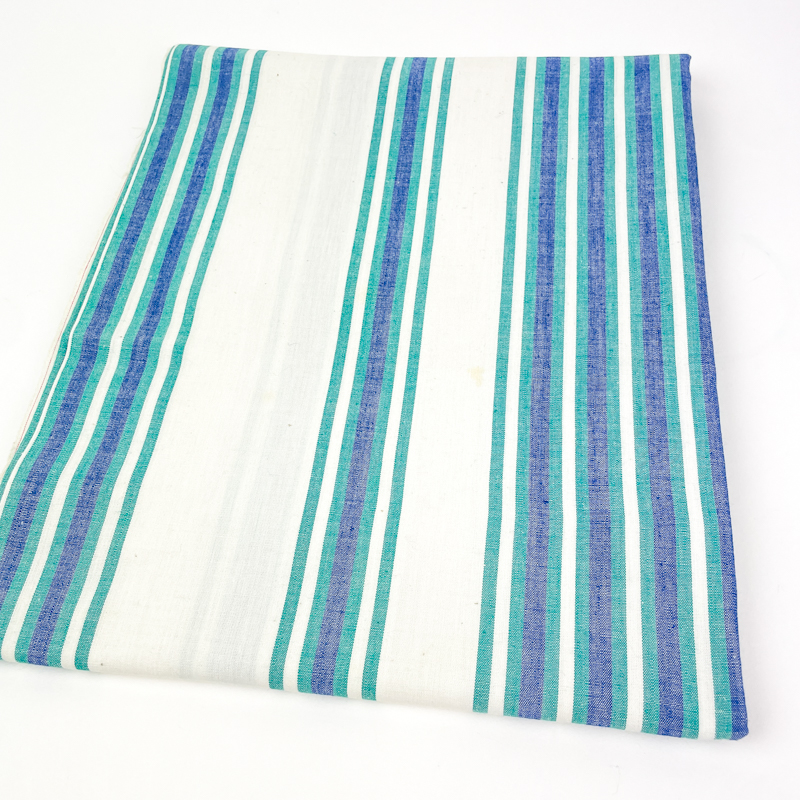 Klassische Retro-Tischdecke aus kräftiger Baumwolle mit Streifen in Blau, Türkis und Weiß.