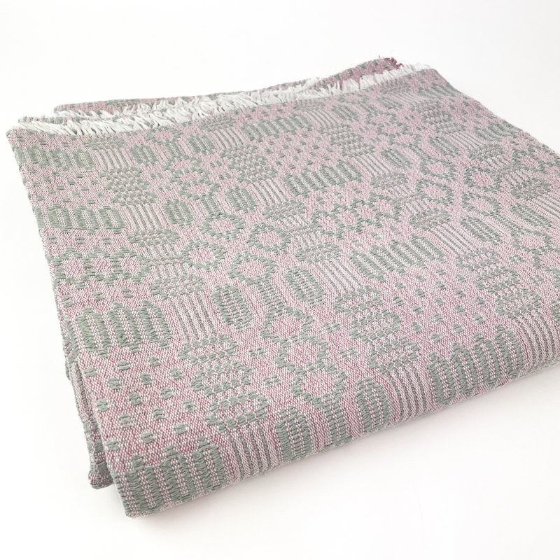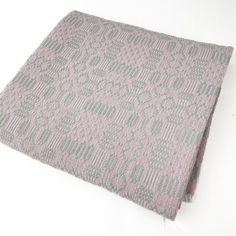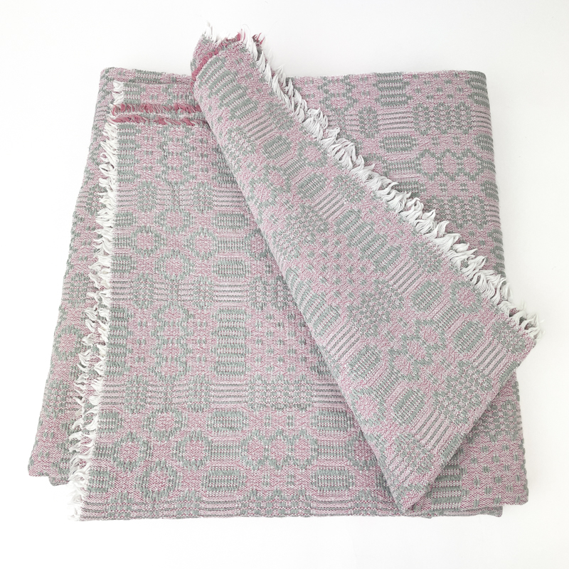 Wunderschöne schwere Vintage-Tischdecke aus gewebter Baumwolle mit Muster in Rosa und Grau.