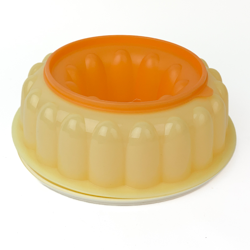 Originale Retro-Puddingform von Tupperware in Gelb mit orangefarbenem Mittelteil und weißem Deckel.