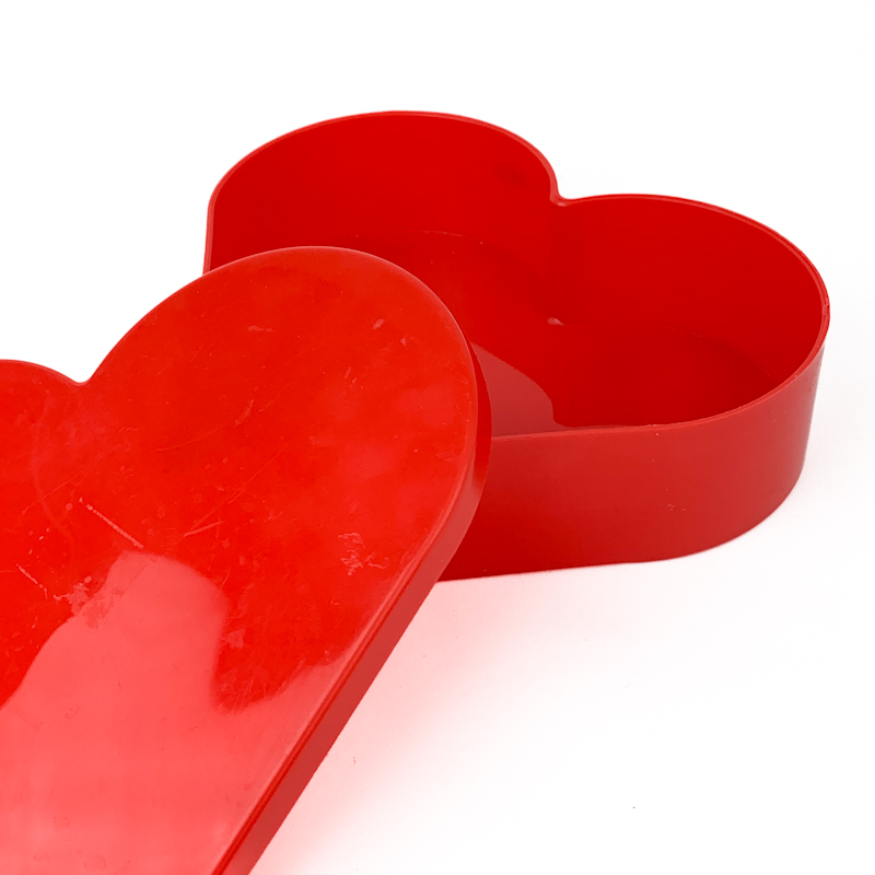 Schöne Retro-Keksdose in Herzform aus kräftigem roten Kunststoff mit Deckel. Typisches 70er-Jahre-Design mit abgerundeten Formen und leuchtender Farbe. Die Dose misst ca. 21 x 20 cm und ist 7 cm hoch. Gut erhalten, sauber und ohne Schäden.