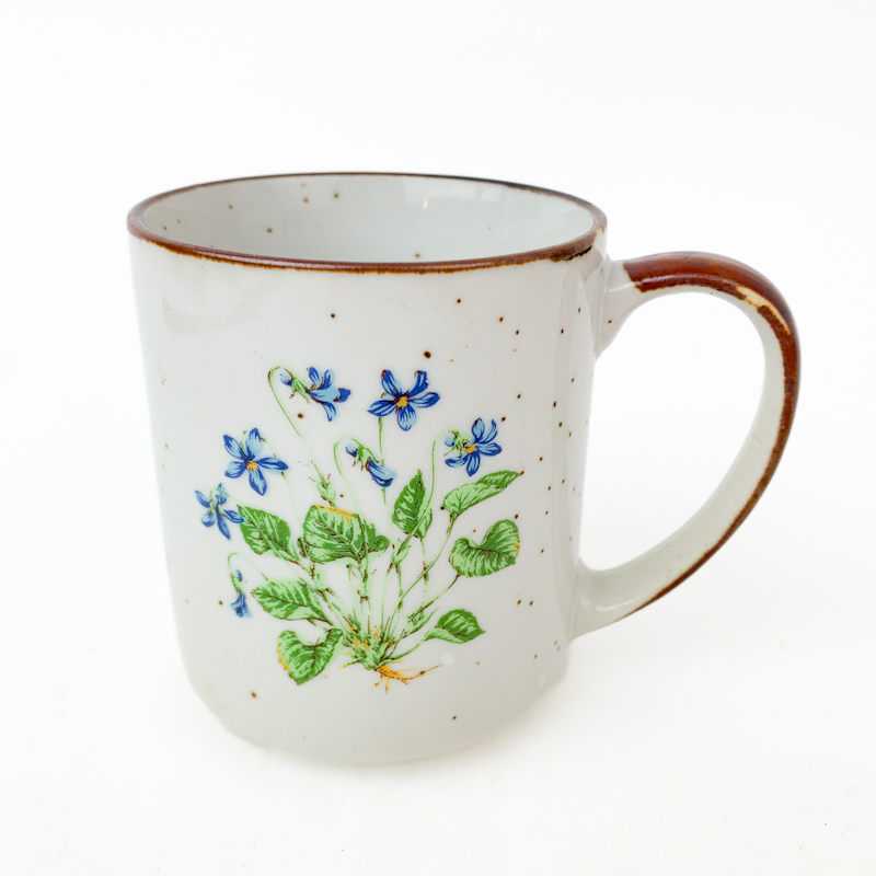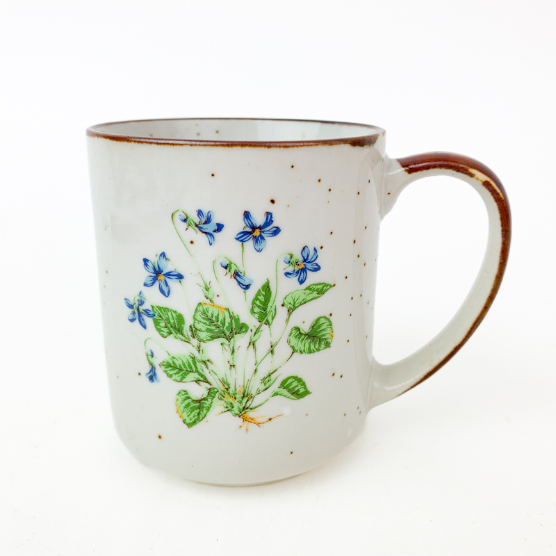 Wunderschöner Retro-Becher aus Steingut mit braunem Rand und Veilchenmotiv. Der Becher ist 9 cm hoch und in sehr gutem Zustand – ohne Schäden oder Kratzer.