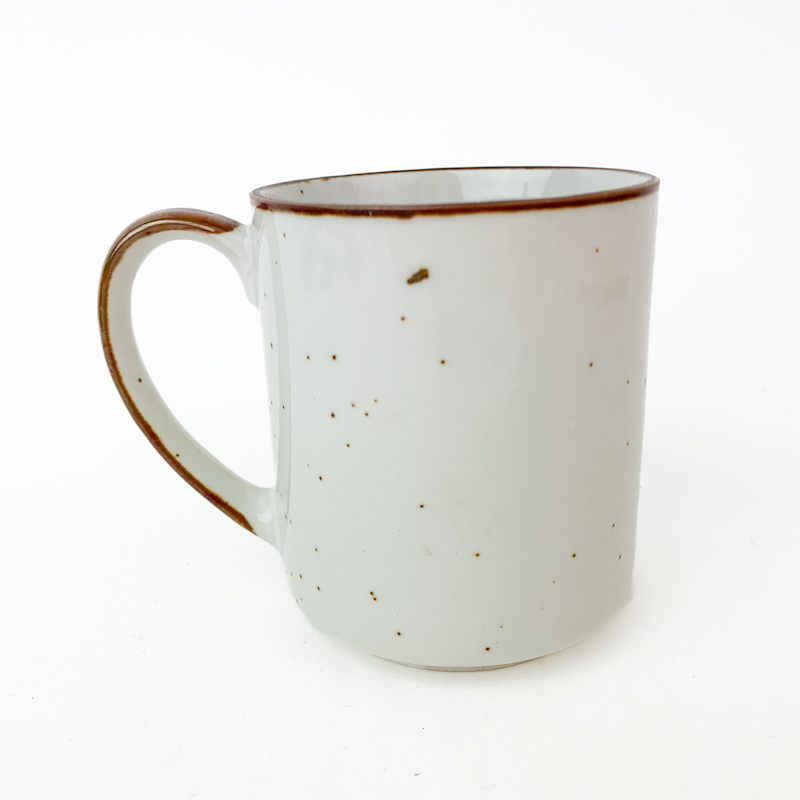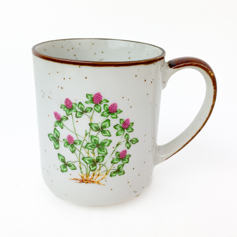 Wunderschöner Retro-Becher aus Steingut mit braunem Rand und Motiv von grünem Klee mit rosa Blüten. Der Becher ist ca. 9 cm hoch und in sehr gutem Zustand – ohne Schäden oder Kratzer.