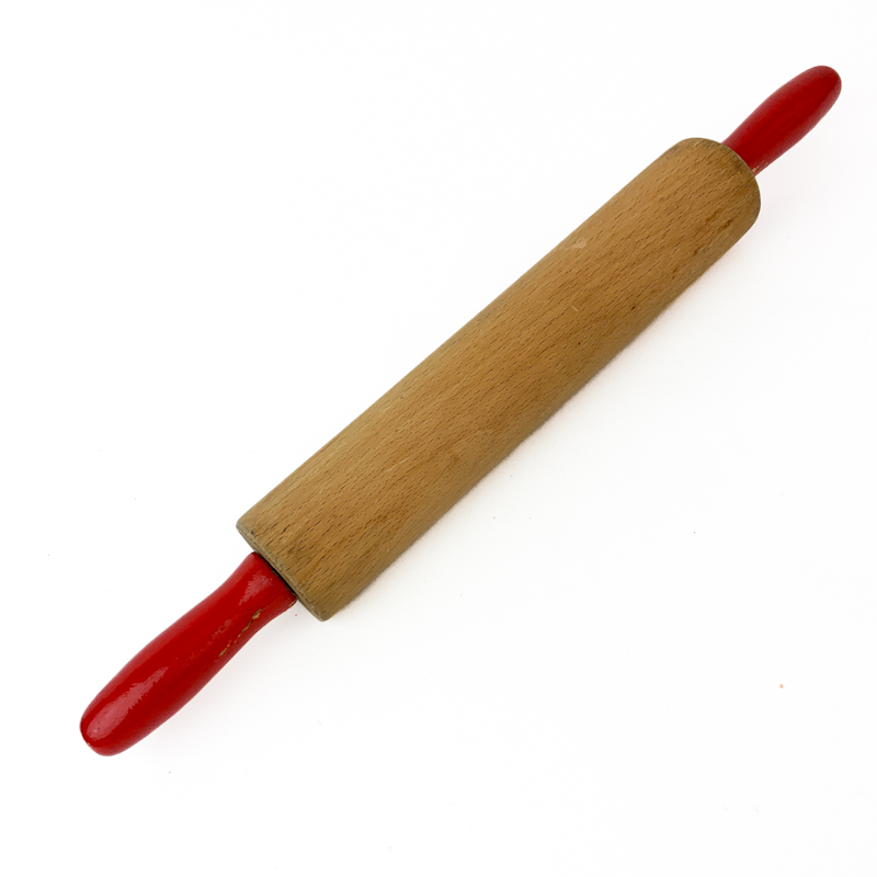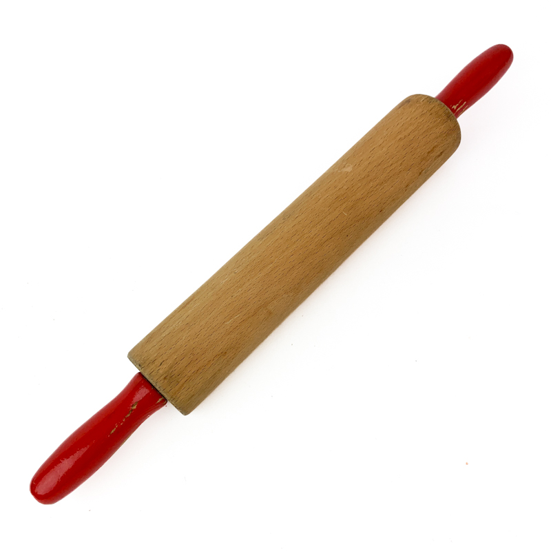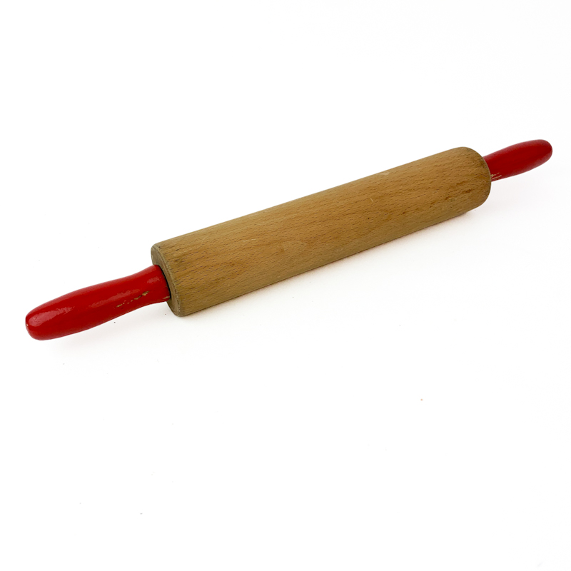 Klassisches Retro-Nudelholz aus Holz mit rot lackierten Griffen.