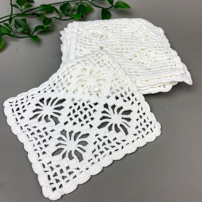 Set mit acht handgehäkelten Zwischenlegen aus weißer Baumwolle.