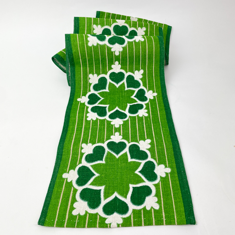 Farbenfroher Retro-Tischläufer aus gewebter Baumwolle mit weißen herzförmigen Blumen auf grün gestreiftem Grund.