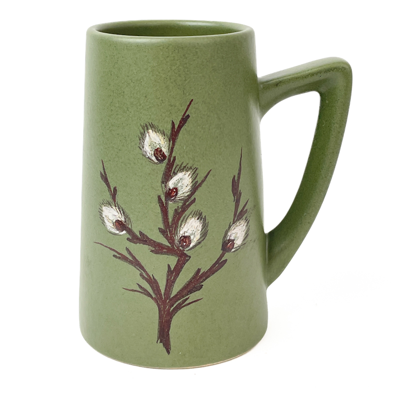 Die matte grüne Glasur verleiht der Vase einen ruhigen, klassischen Ausdruck, und der schlichte Henkel rundet die Form ab.