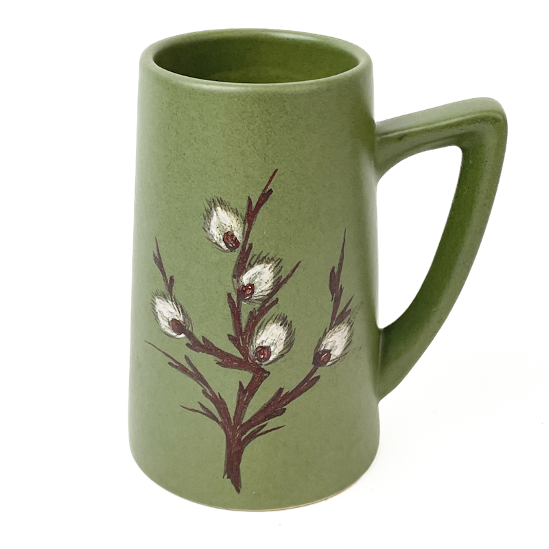 Wunderschöne Retro-Vase aus Steinzeug mit handgemaltem Motiv von Frühlingsknospen in gedämpften Weiß- und Rottönen.