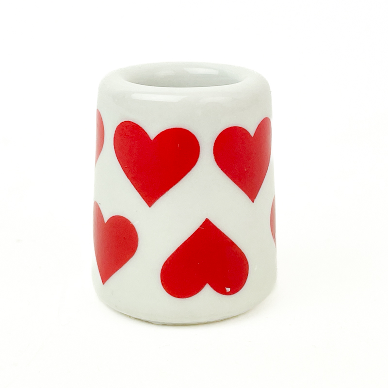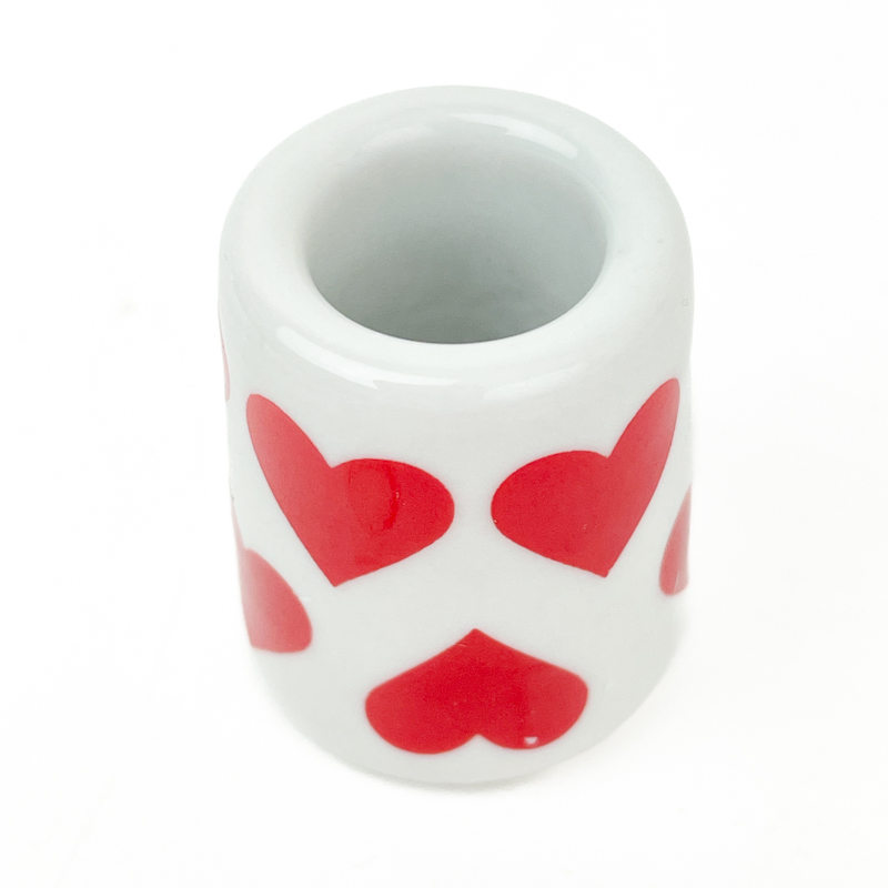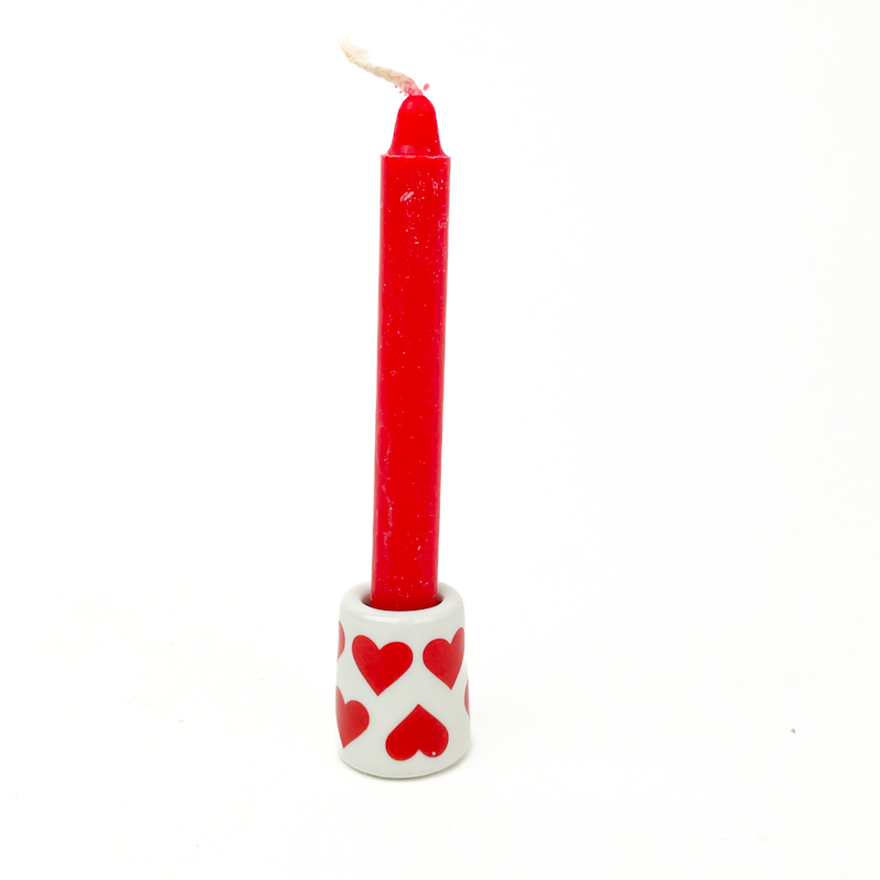 Wunderschöner kleiner vintage Kerzenhalter aus weißem Porzellan mit roten Herzen rundum.