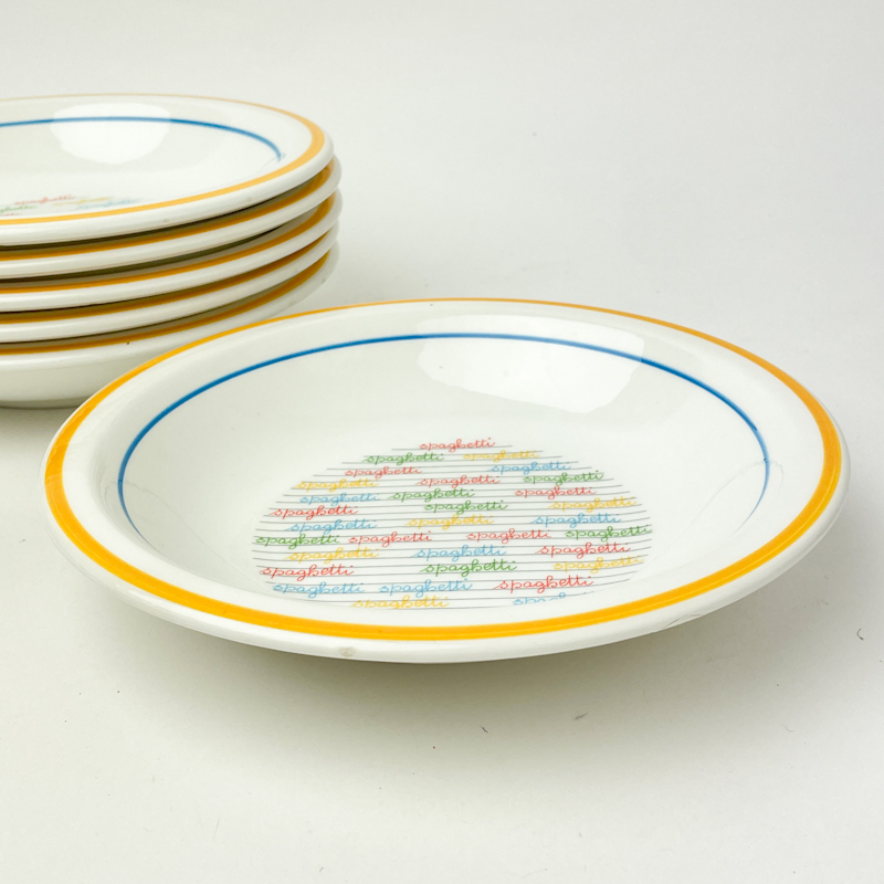 Wunderschöner Vintage-Pastateller mit farbigem Spaghetti-Motiv im typischen italienischen Design der 70er Jahre.
