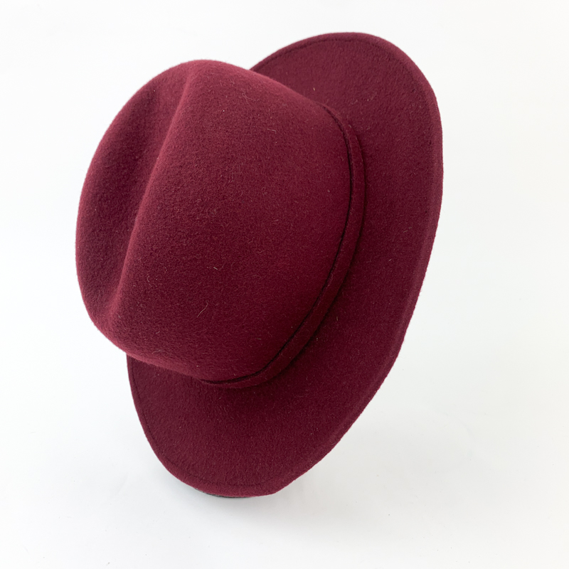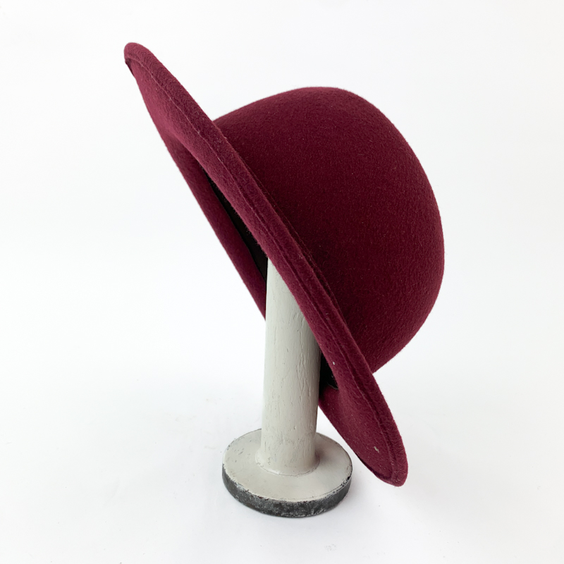 Wunderschöner Vintage-Hut aus bordeauxfarbener Wollfilz mit fester Form und leicht gebogener Krempe.