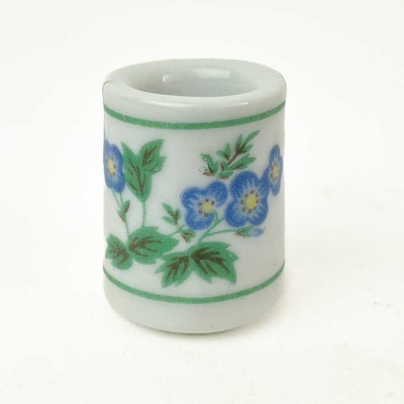 Wunderschöner kleiner vintage Kerzenhalter aus weißem Porzellan mit blau Blumen und grünen Blättern.