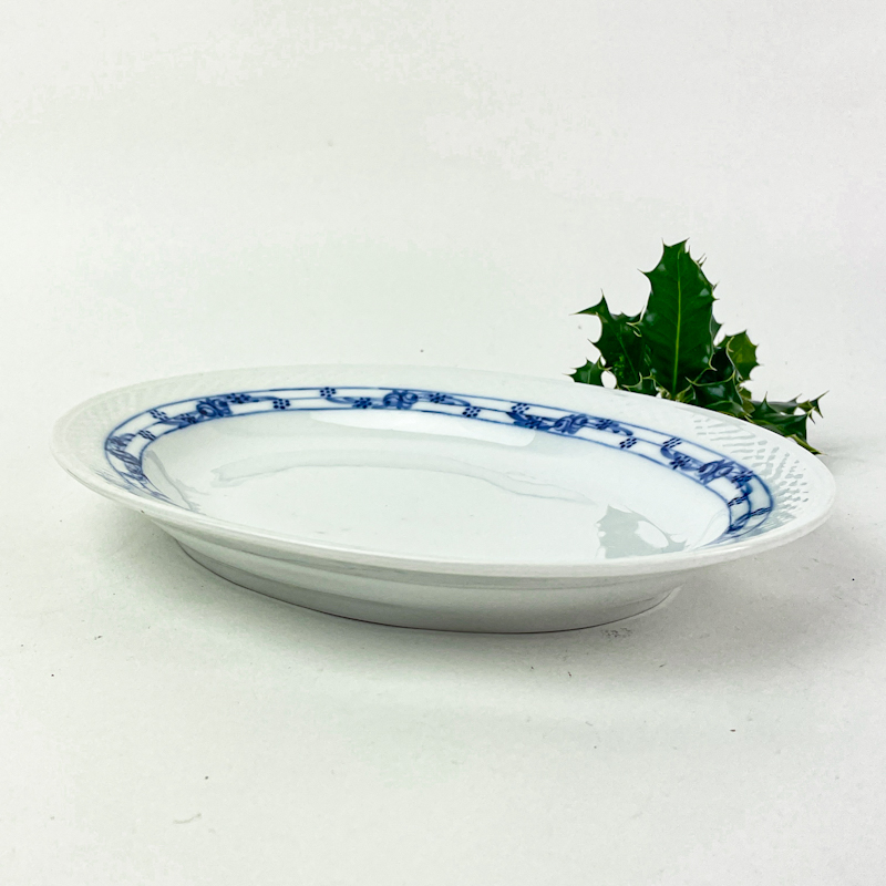 Wunderschöne ovale Platte von Royal Copenhagen aus dem Rosenknospe-Service mit klassischer handgemalter blauer Bordüre und feiner Reliefkante.
