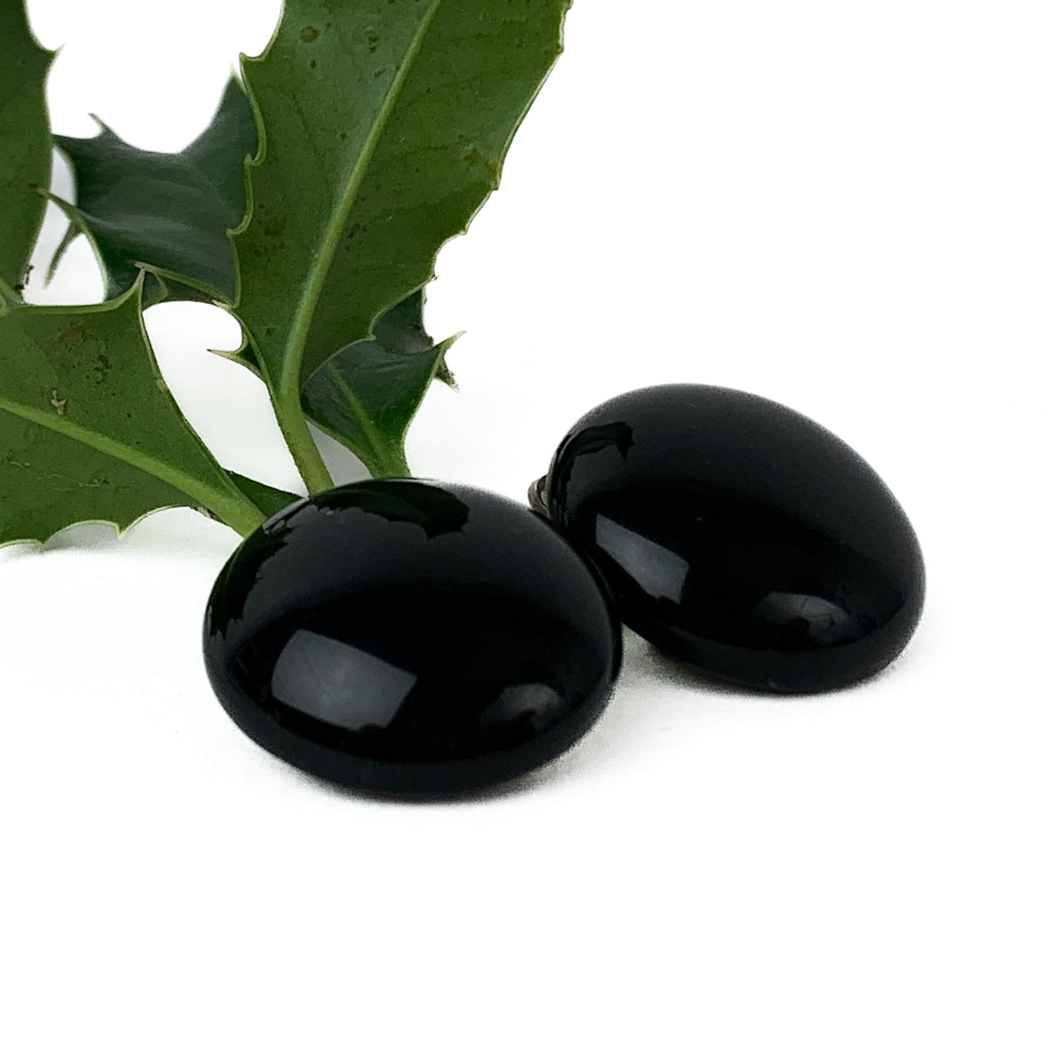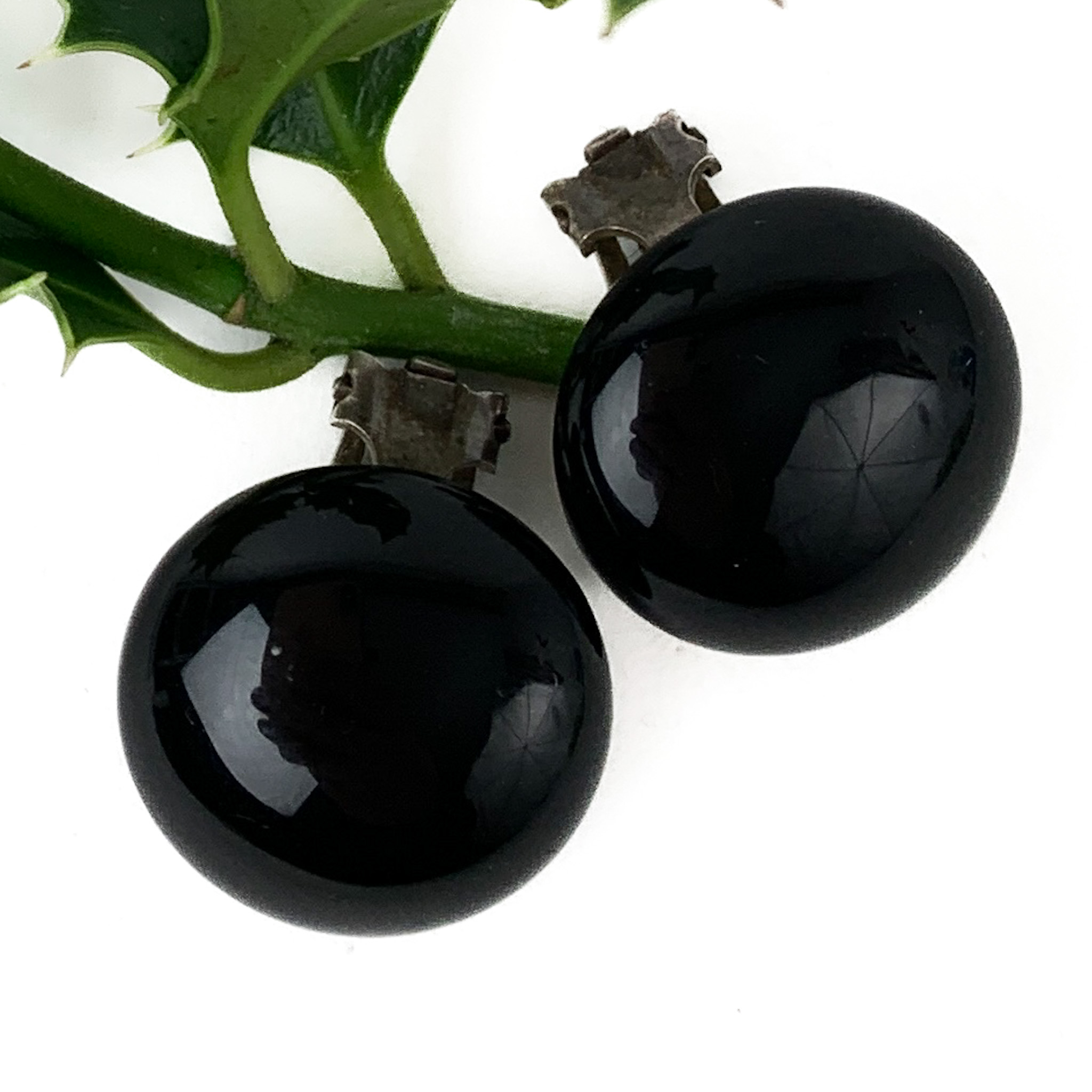 Wunderschöne Vintage Ohrclips aus schwarzem Bakelit mit 925-Silberclips auf der Rückseite. Die runden Bakelitknöpfe haben eine glatte, glänzende Oberfläche und sind in sehr gutem, gepflegtem Zustand. Durchmesser ca. 1,5 cm.