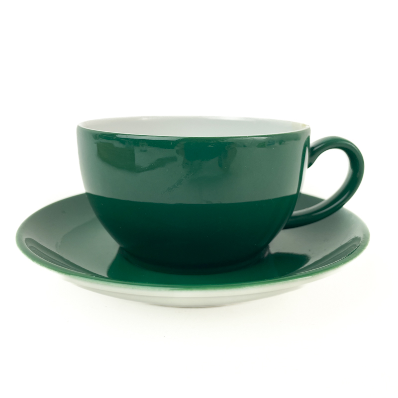 Die Tasse besteht aus glasiertem Porzellan mit weißer Innenseite und einer tiefgrünen Außenseite – typisch für deutsche Qualitätsproduktion.