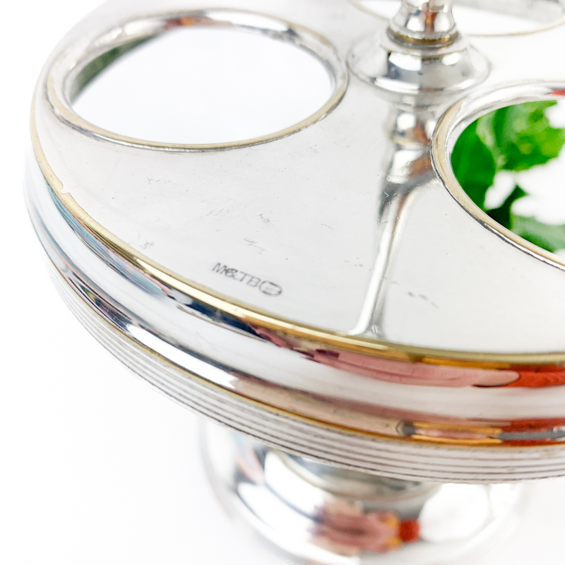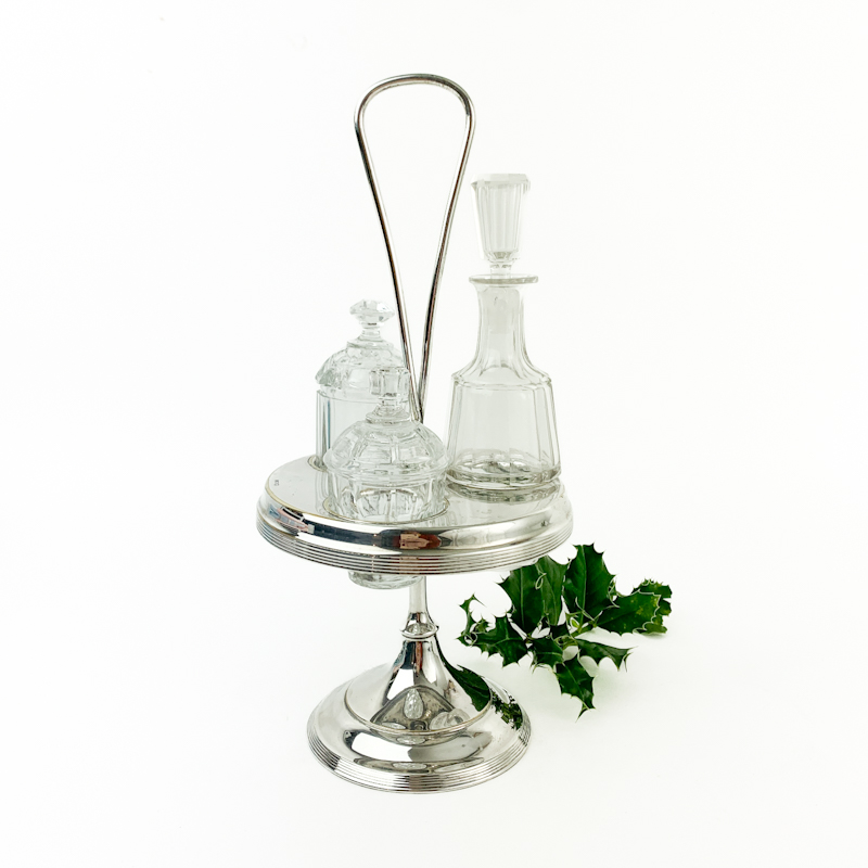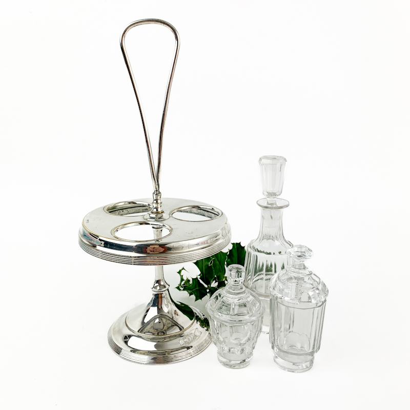 Wunderschöne vintage Plate de Menage, versilbert und mit drei originalen Glasflaschen. Der Ständer besitzt eine klare Punze, feine Details und eine klassische Formgebung. Das Set ist gut erhalten, ohne Schäden, und hat eine Höhe von 29 cm.