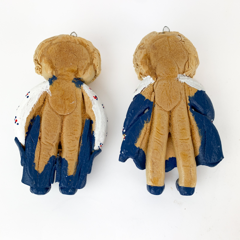 Beide haben einen Aufhänger auf der Rückseite und sind typische Stücke der dekorativen Salzteigkunst der 1970er Jahre.