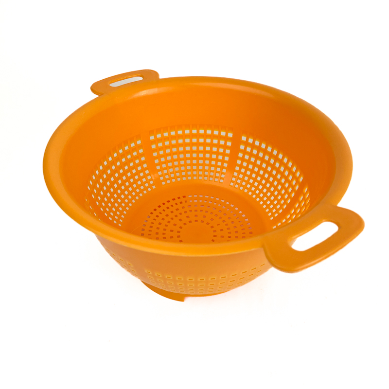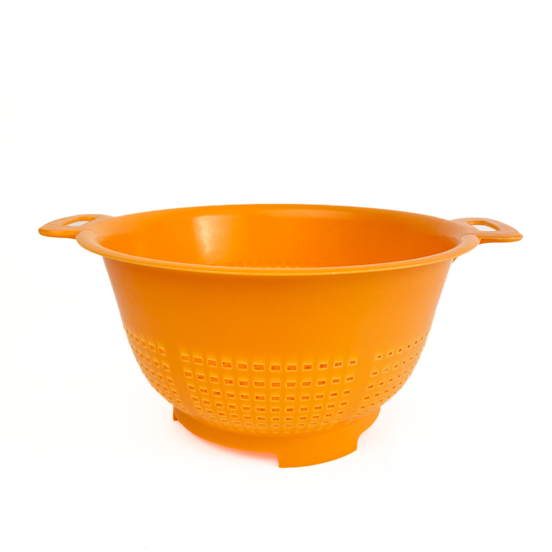 Klassisches gelbes Retro-Sieb von Rosti aus stabilem Kunststoff mit typischen quadratischen Abflusslöchern und handlichen Griffen.