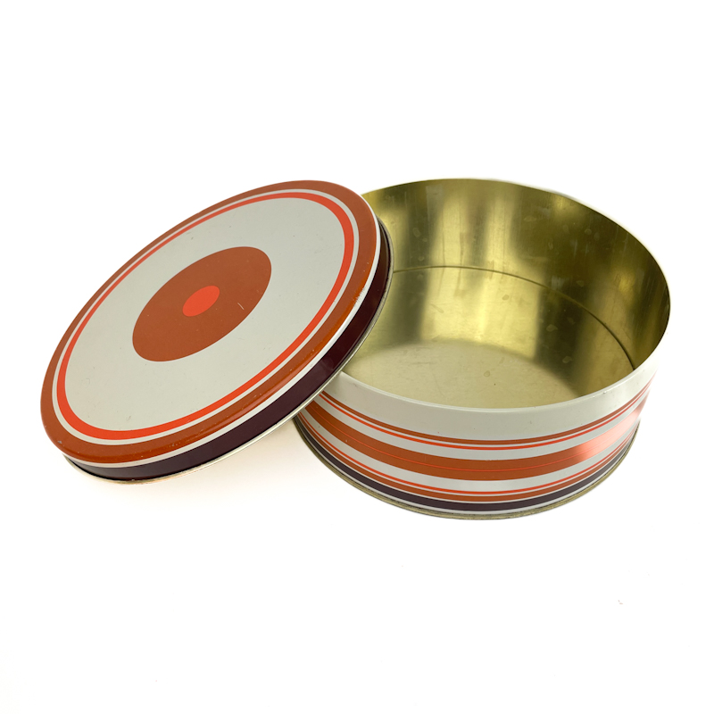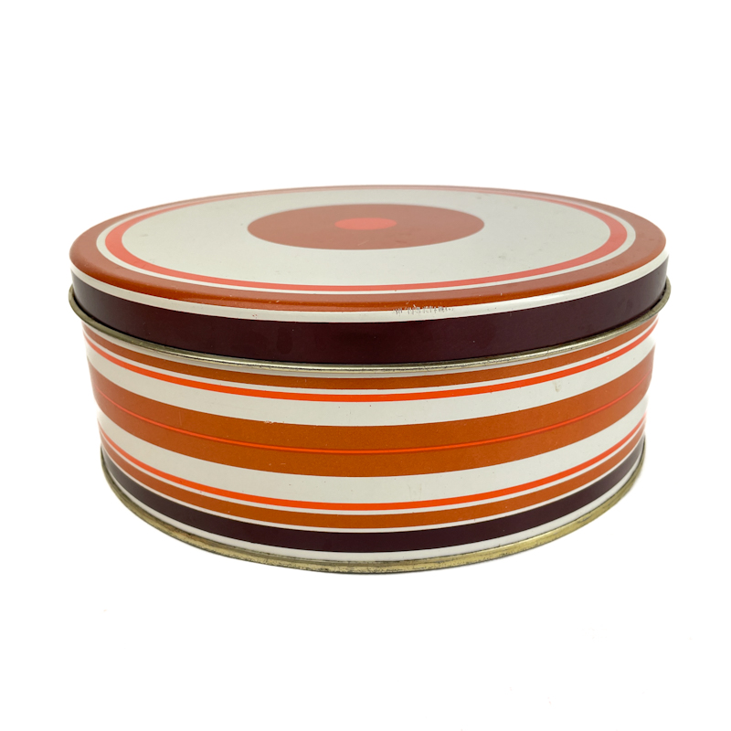 Schöne Retro-Keksdose aus Metall mit Streifen in Rot, Orange, Rost und Weiß sowie Kreisdekor auf dem Deckel.