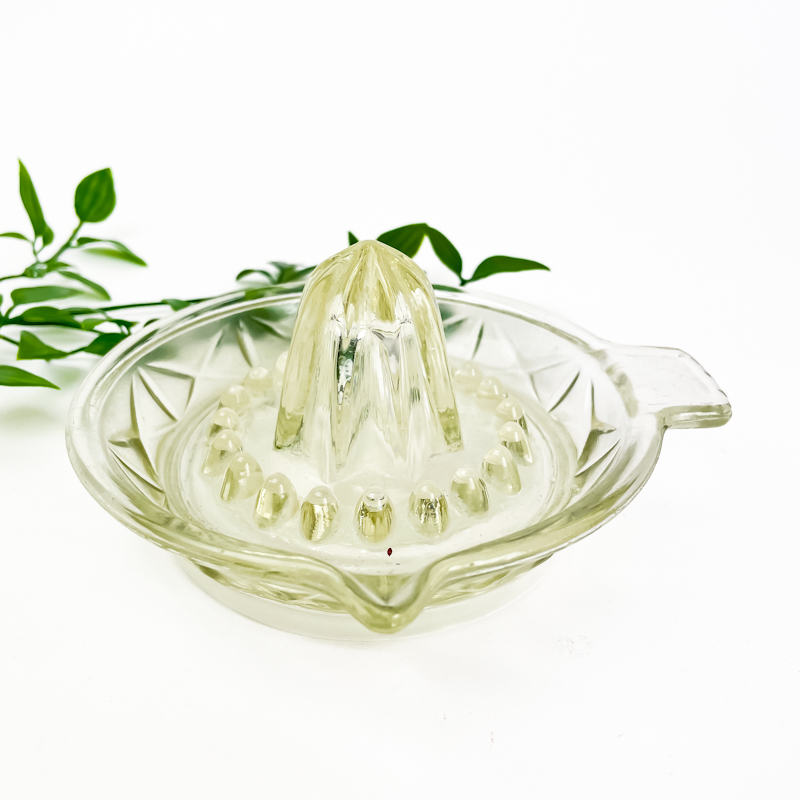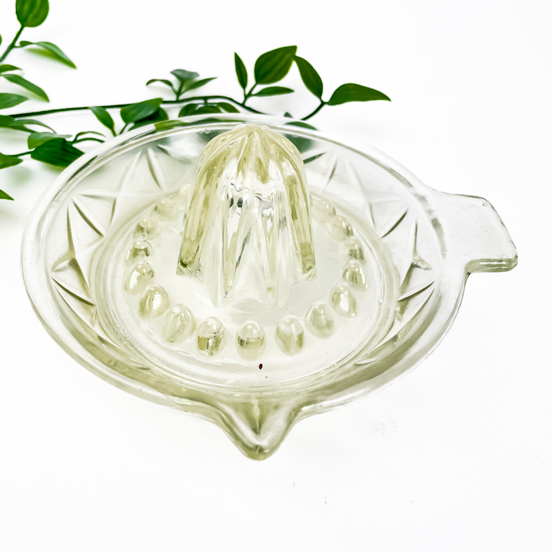 Wunderschöne retro Zitruspresse aus klarem, gegossenem Glas mit dekorativen Facetten und praktischem Griff.