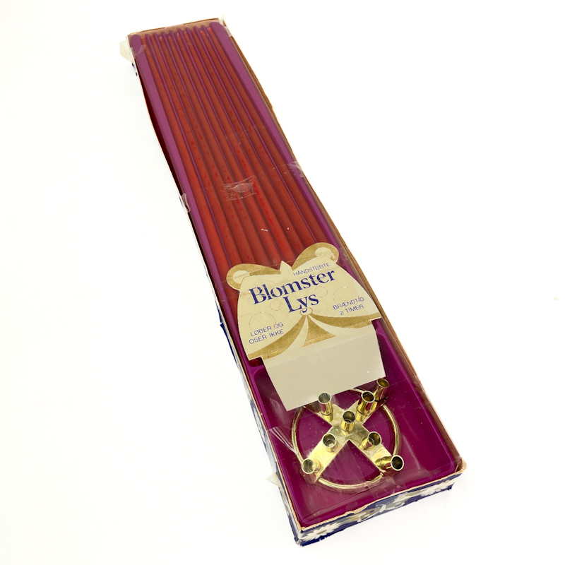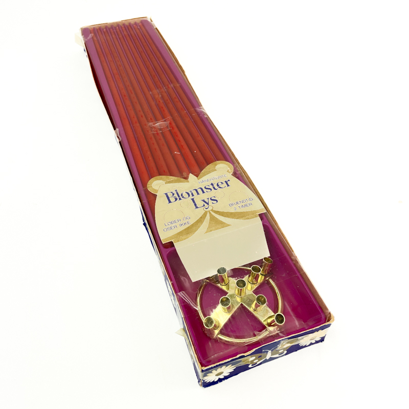 Rote vintage Blumenkerzen in der Originalschachtel zusammen mit einem goldfarbenen Kerzenhalter.