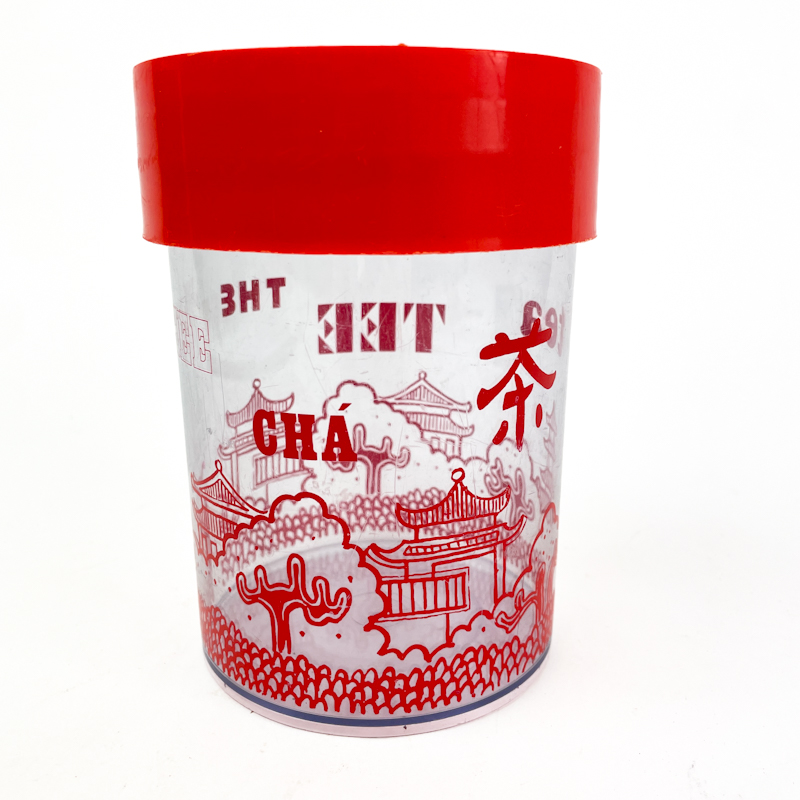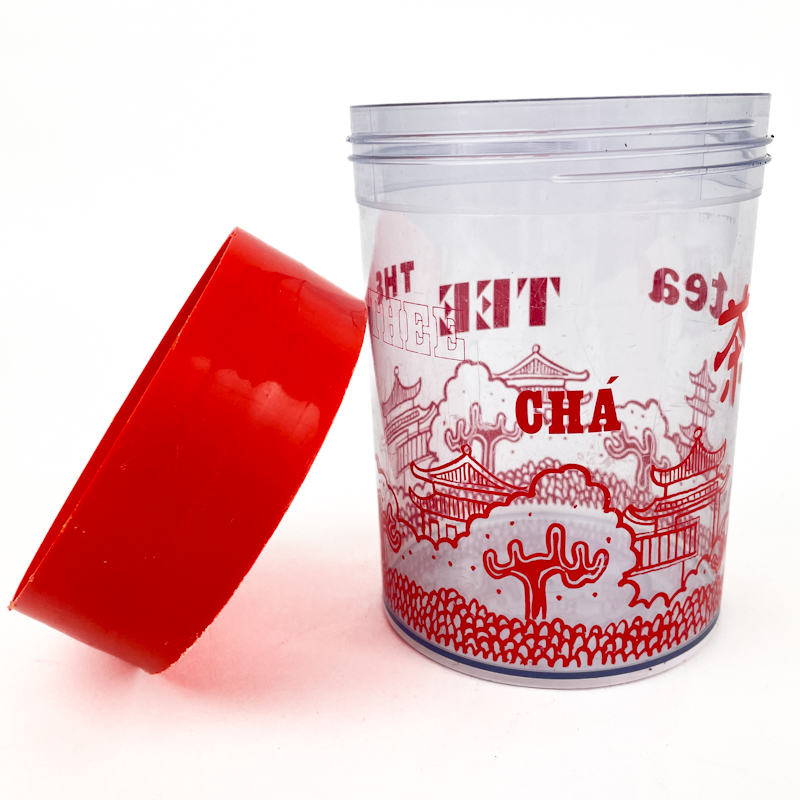Vintage-Teedose nach Design von Erik Kold mit klarem Behälter und rotem Deckel mit asiatisch inspiriertem Dekor.