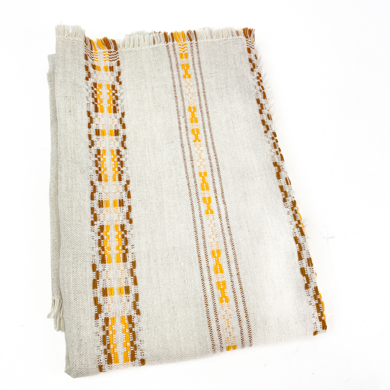 Wunderschöne Vintage-Tischdecke aus kräftiger, reiner Baumwolle mit eingewebten Borten in warmen Gelb- und Goldbrauntönen auf naturfarbenem Grund.