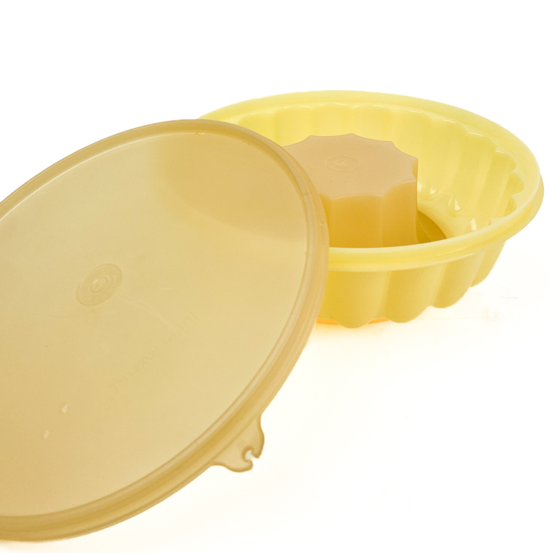 Gelbe Vintage-Eisform von Tupperware mit typischer gerippter Form und originalem Deckel.