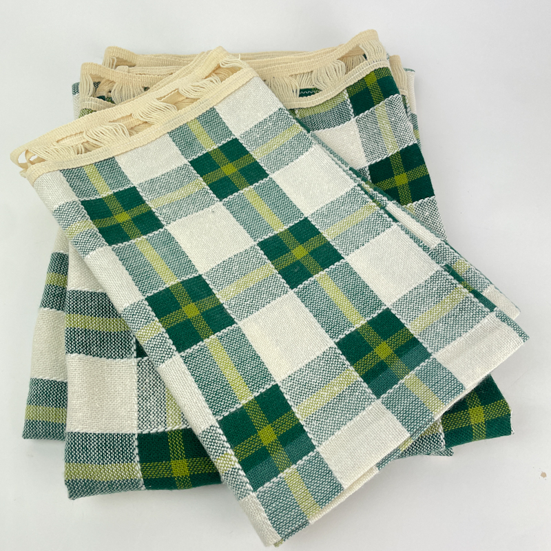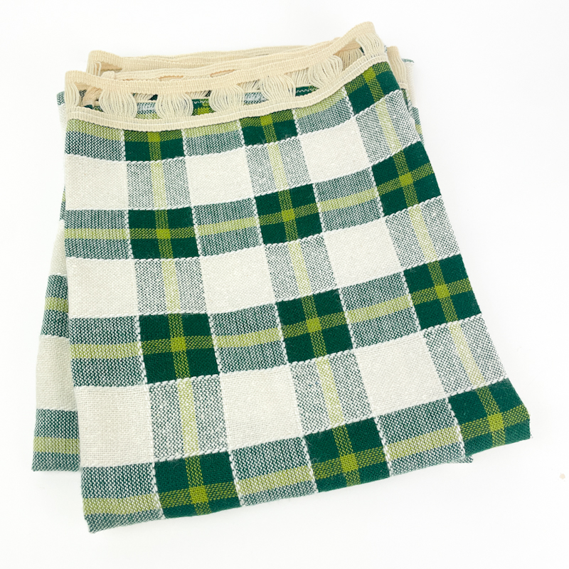 Klassisches Küchengardinen-Set aus bügelfreiem Kunstgewebe mit Karomuster in Grün, Hellgrün und Naturweiß.