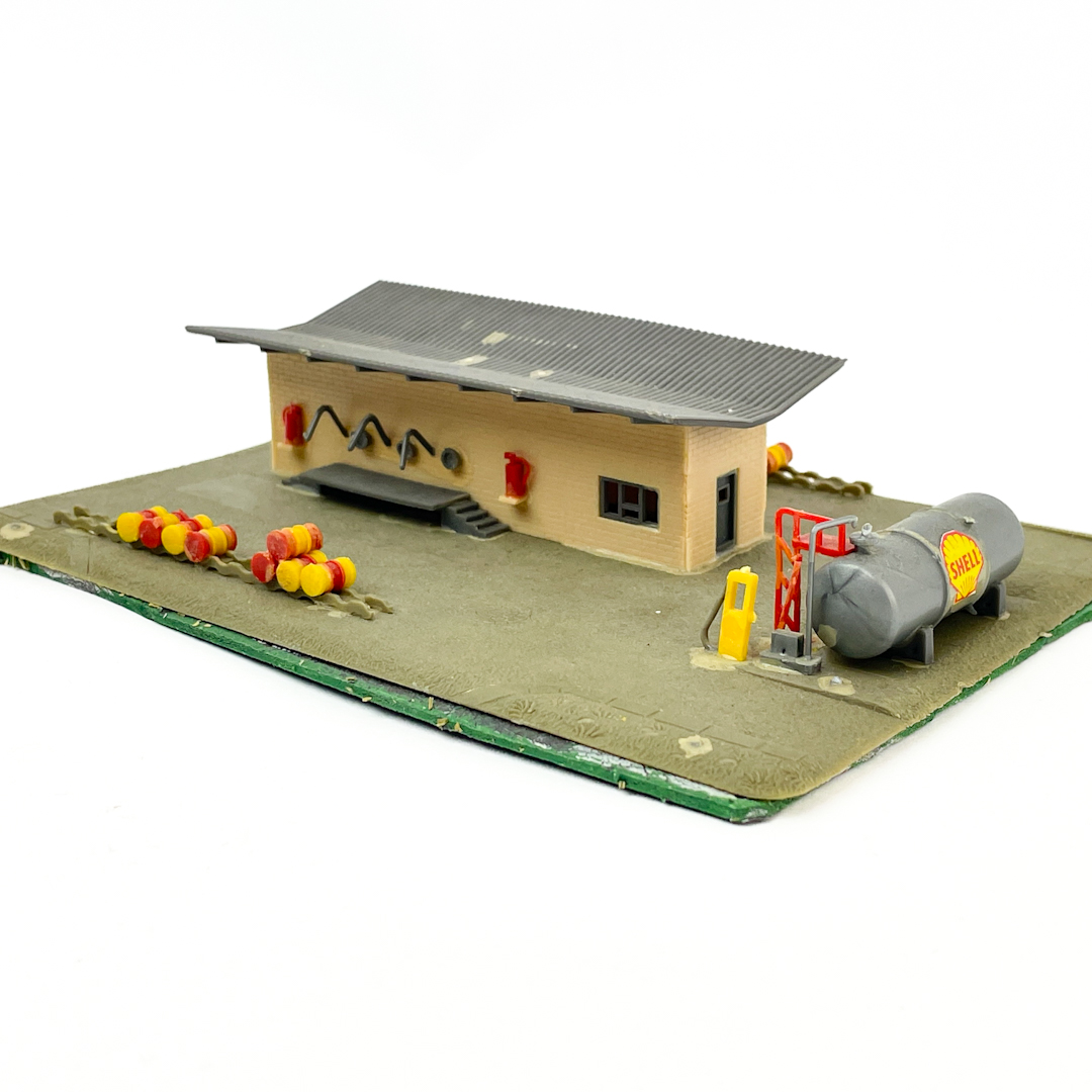 Das Gebäude zeigt ein kleines Öl-Depot mit Shell-Tank, Pumpen, Schläuchen und Fässern in Gelb und Rot.
